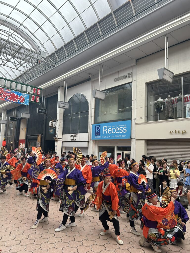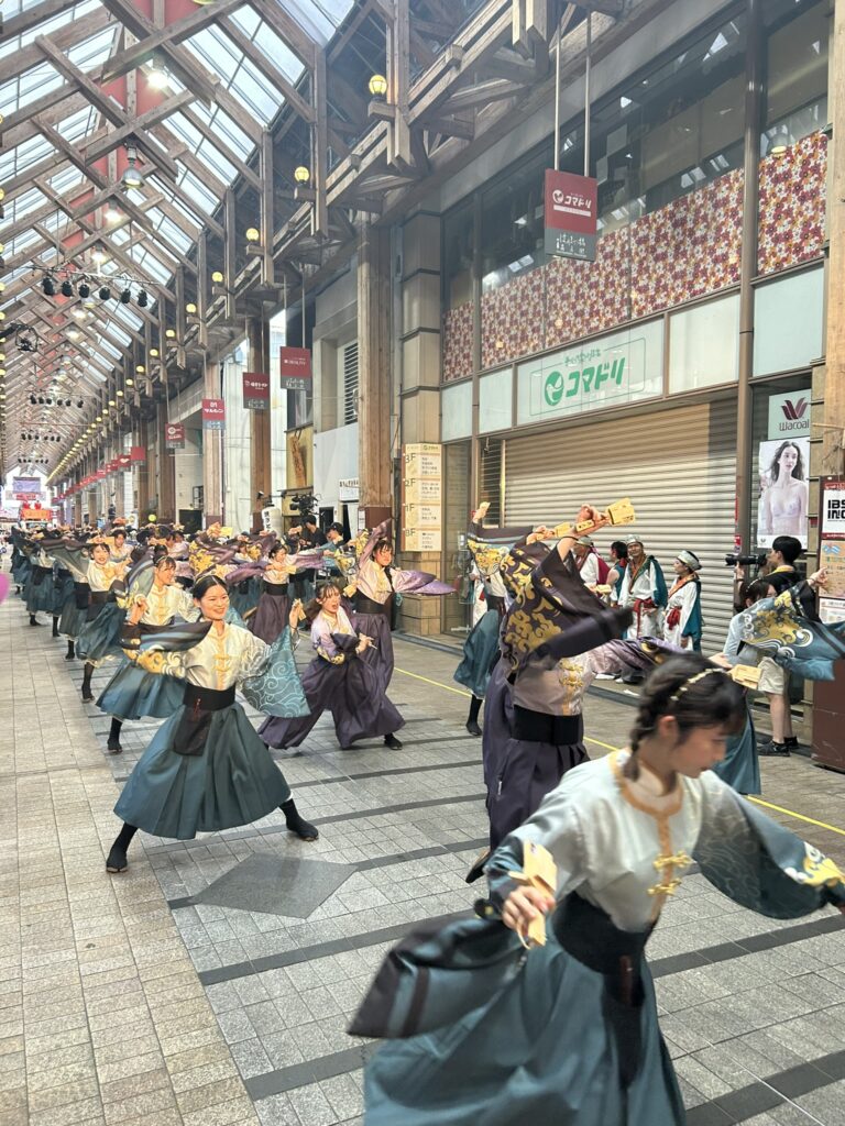 At 18:00, the festival began. Matsuyama was the birthplace of baseball in Japan, so this dance festival was supposed to celebrate it. The groups performed once inside the arcade and then left. Our location was used for passage.