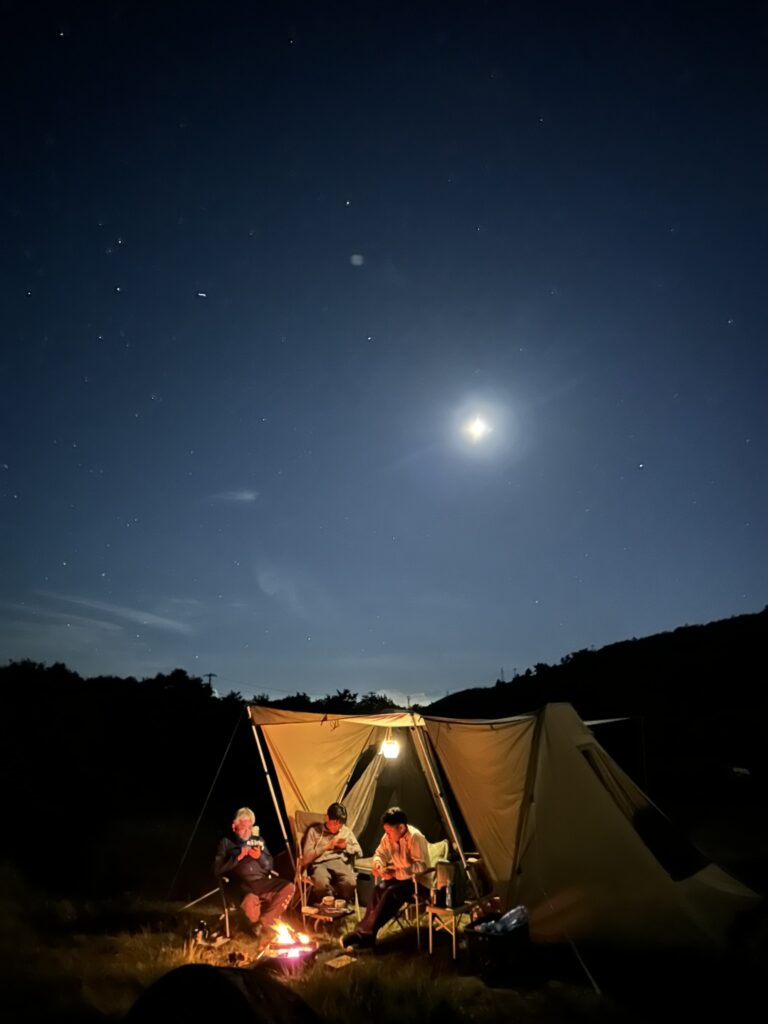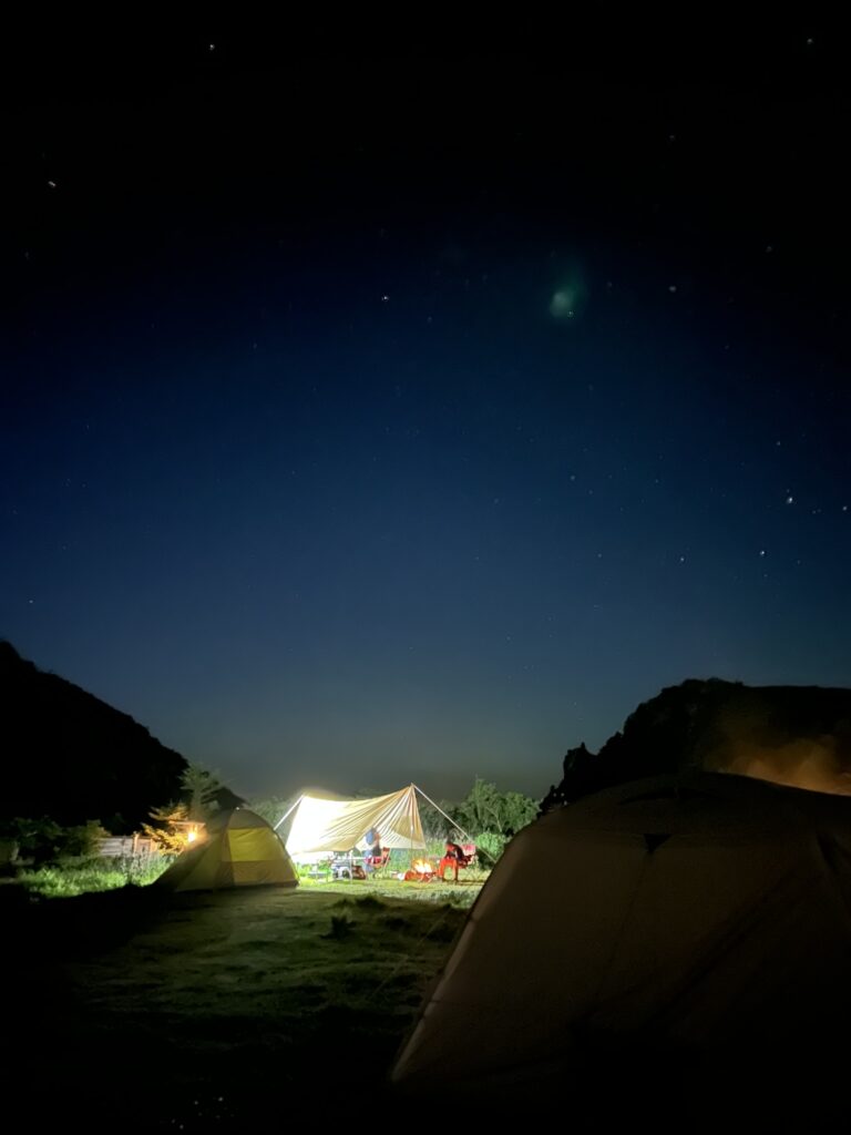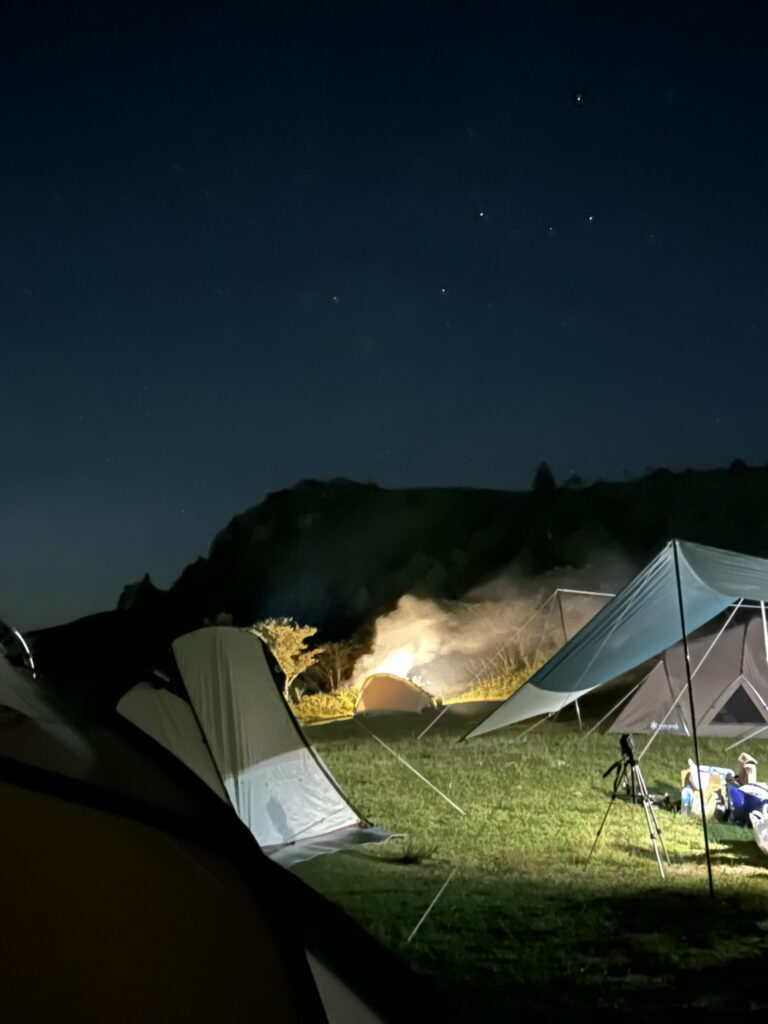 There were already five tents or so. The Japanese campers who had pitched them were no amateurs. They were family-sized and included canopies, grills, firewood, full-blown feasts. We were the only ones late and ill-prepared. Our two-person tent, one chair, and konbini provisions paled in comparison with their charred meat and camembert cheese.