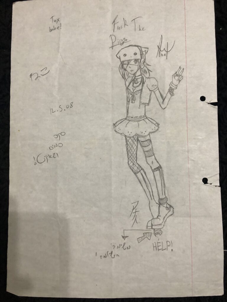 I kept nearly every drawing or painting I’d produced in childhood, including a notebook full of Fakemon I had designed with a friend. I’d drawn the Dango family everywhere; too many relics act as proof. Eventually it became a running gag for my friends to draw them being tortured or killed. For example, from a girl in Japanese class: