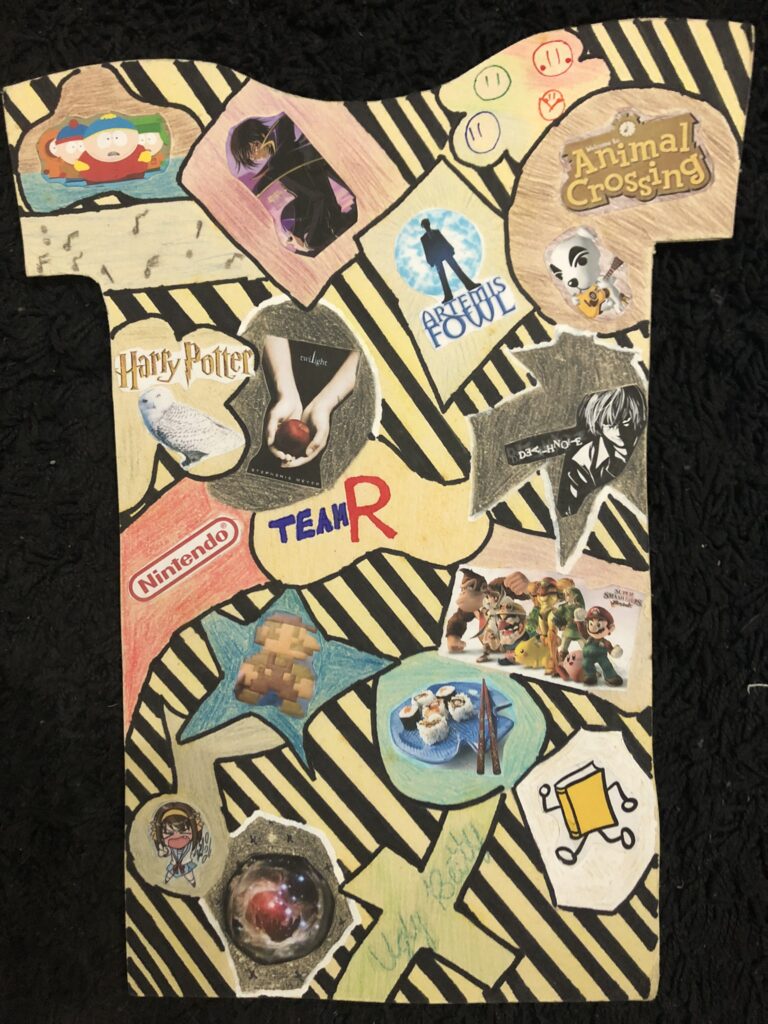 Here is a cardboard t-shirt we did in arts and crafts class that I decorated with my then-obsessions: