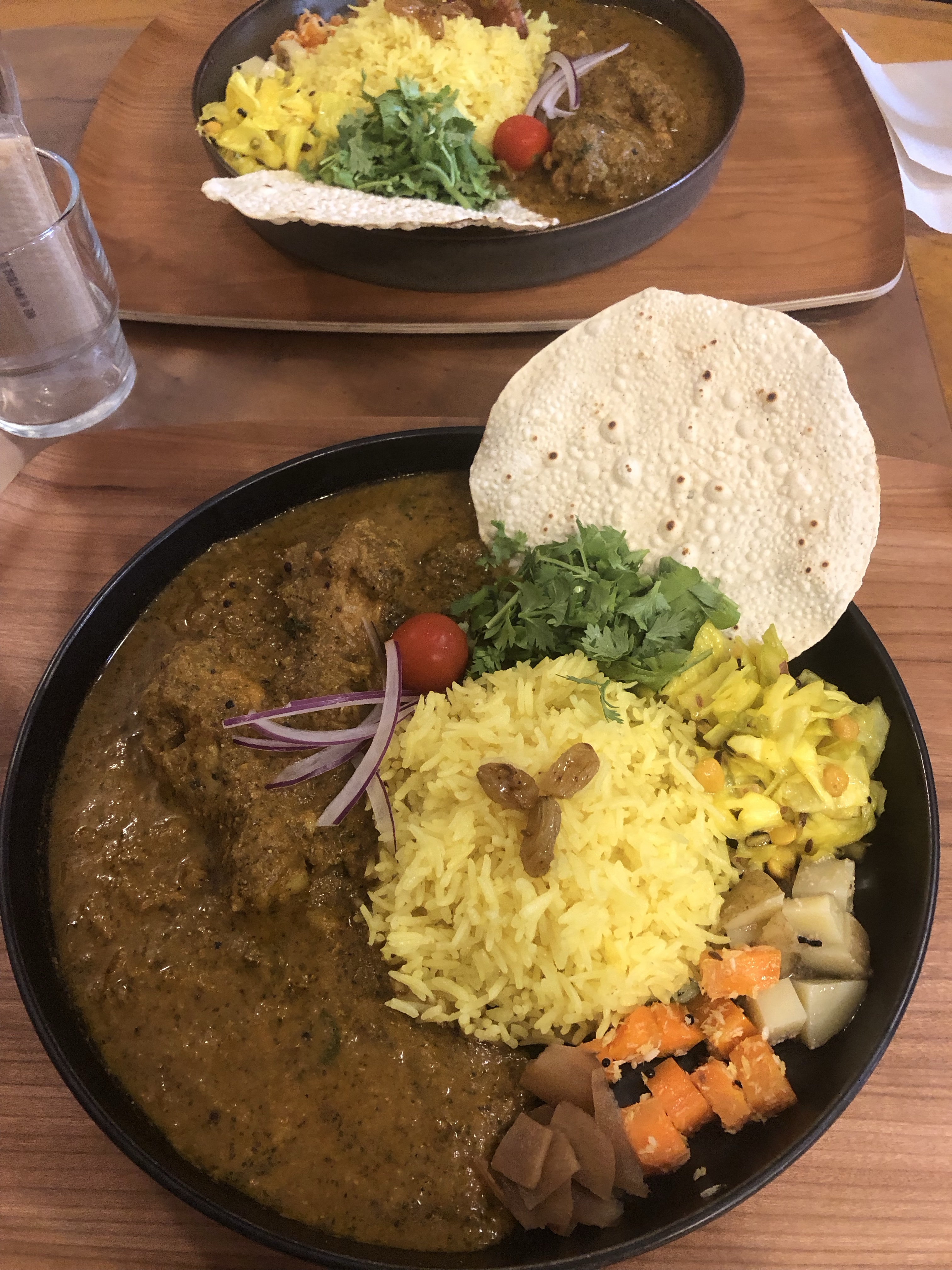 The curry was excellent, homemade, with vegetables and a thin, crunchy bread. I gave Saki my meat.