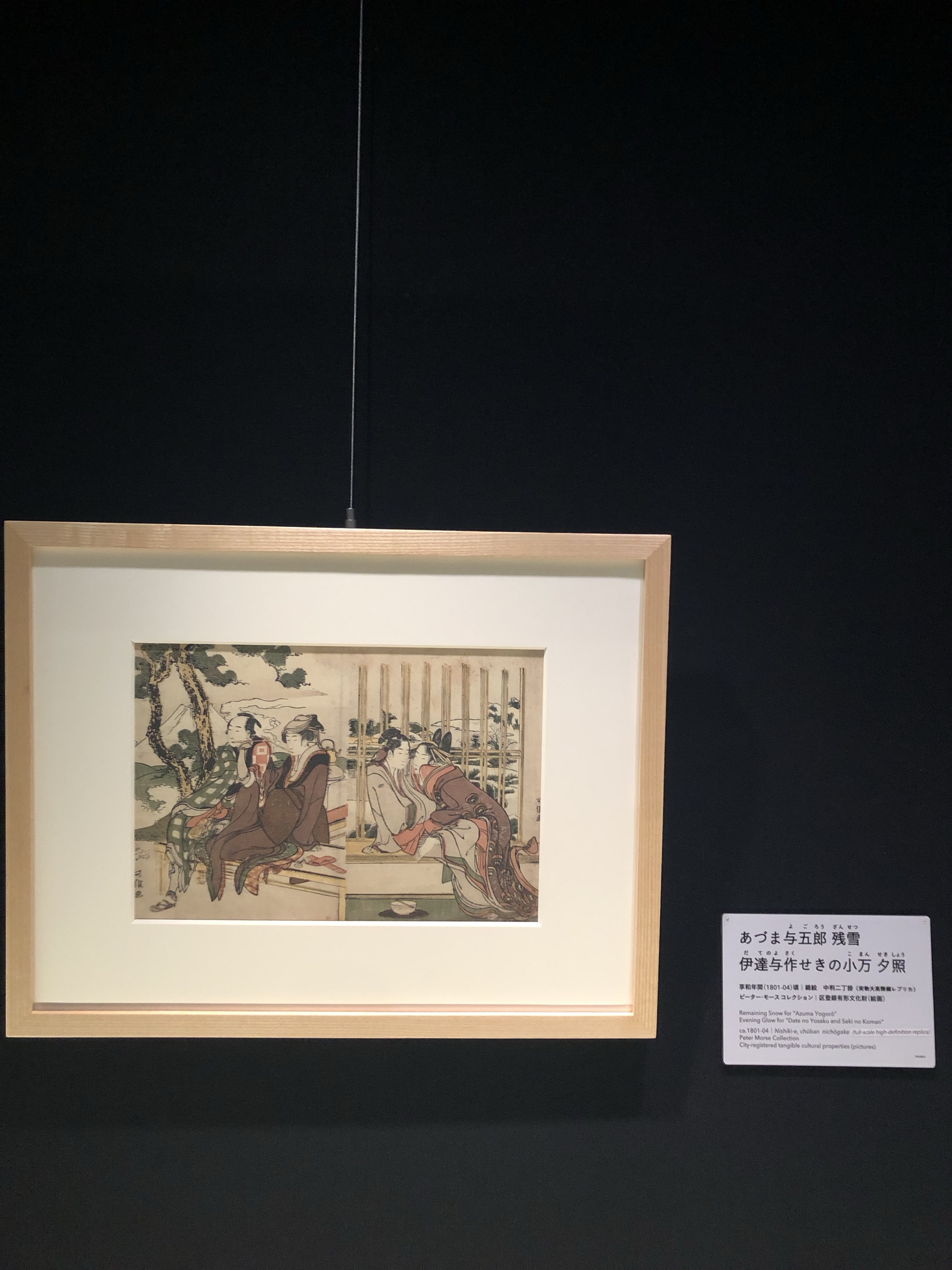 There were ukiyo-e woodblock prints and nishiki-e (multicolored ukiyo-e). All replicas. I wasn’t sure if the originals had survived. The Great Wave, for example, was not being displayed to the public. The original prints were too fragile for that.