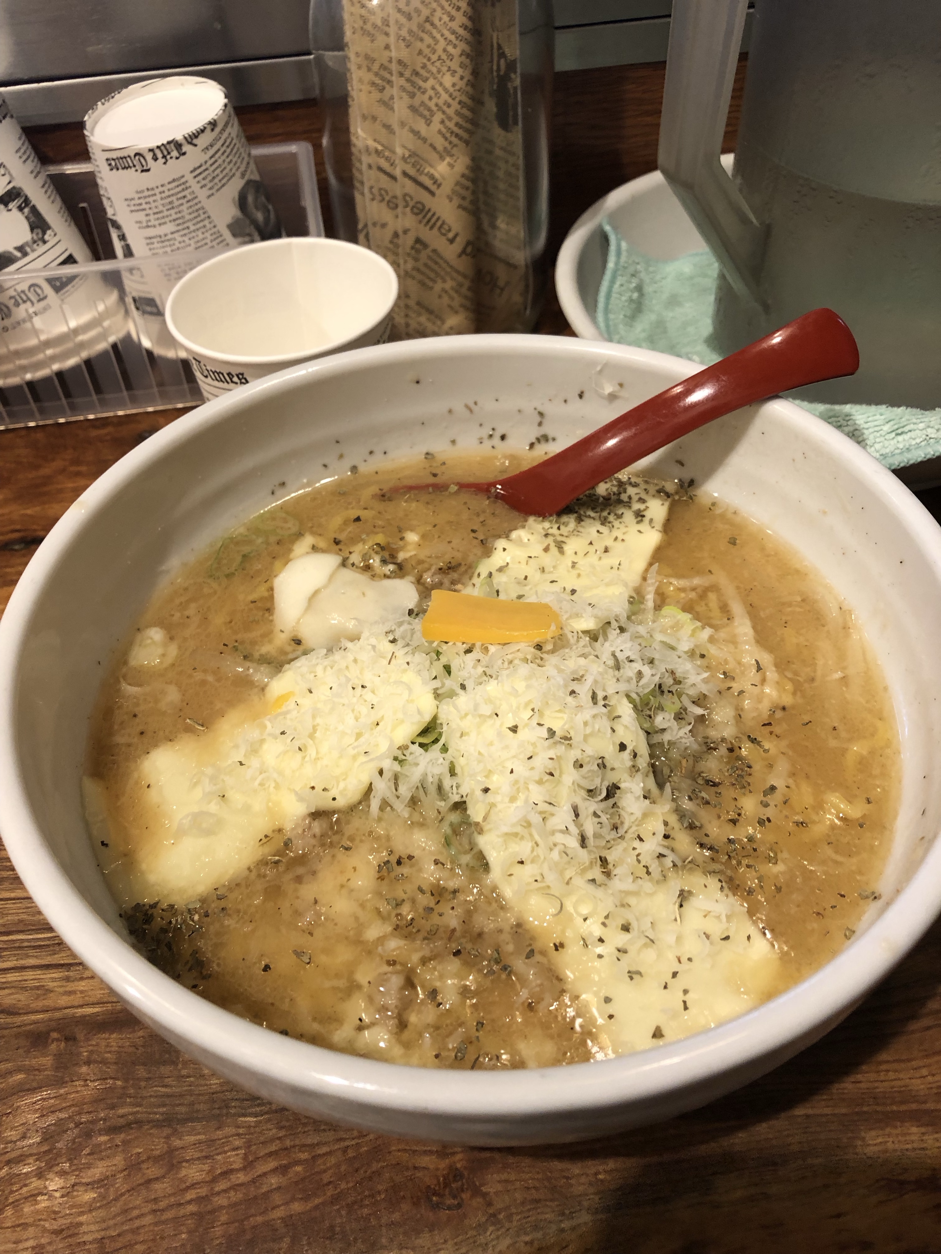 We queued up and ordered the same miso cheese ramen. Thick, heavy, cheesy sauce. Only in Hokkaido.