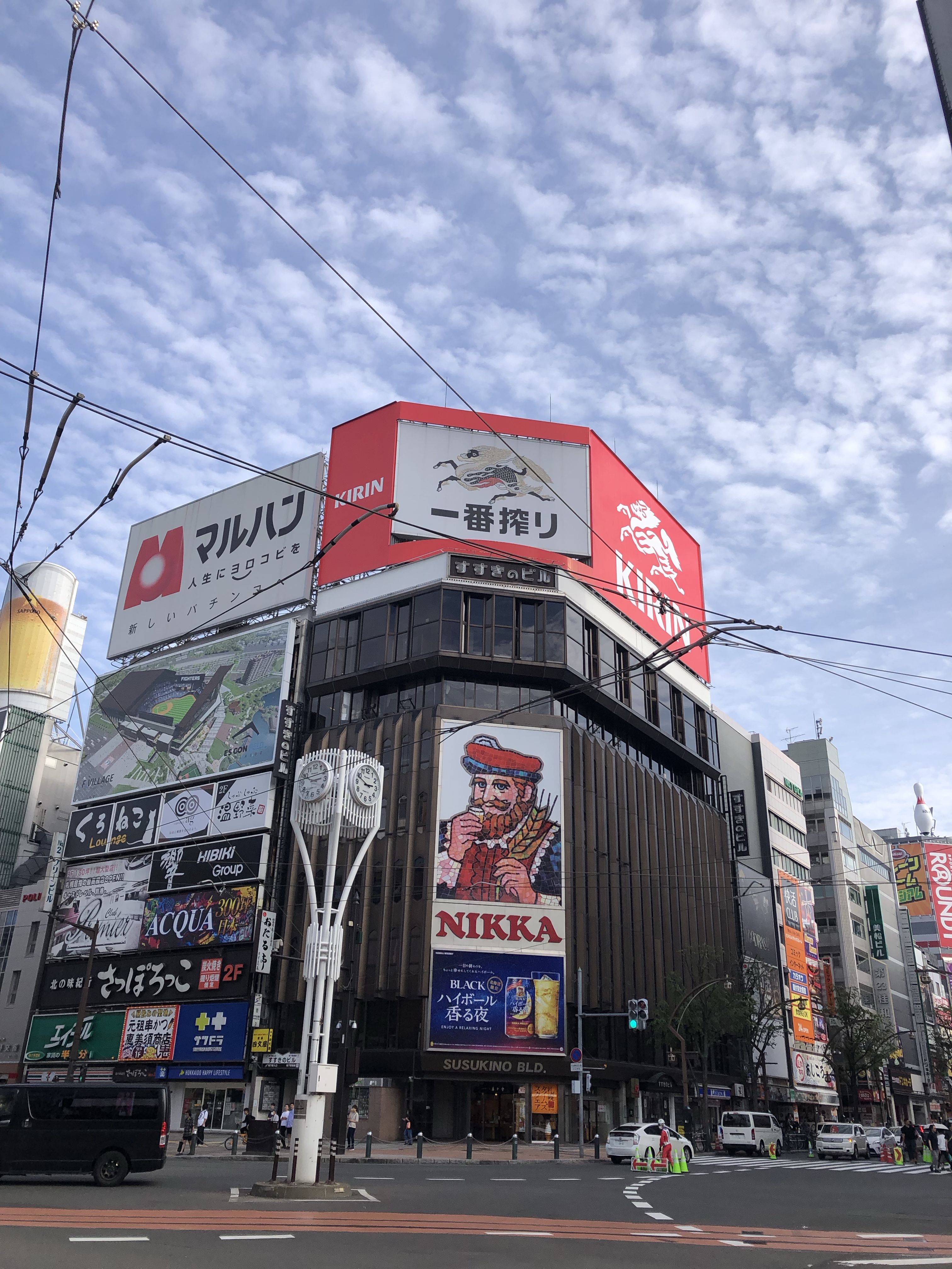 Fine. I walked to my hostel in south Susukino, passing the famous Nikka whisky distillery billboard (which I’d visit this time around) and the venue of the Susukino ice sculptures from February.