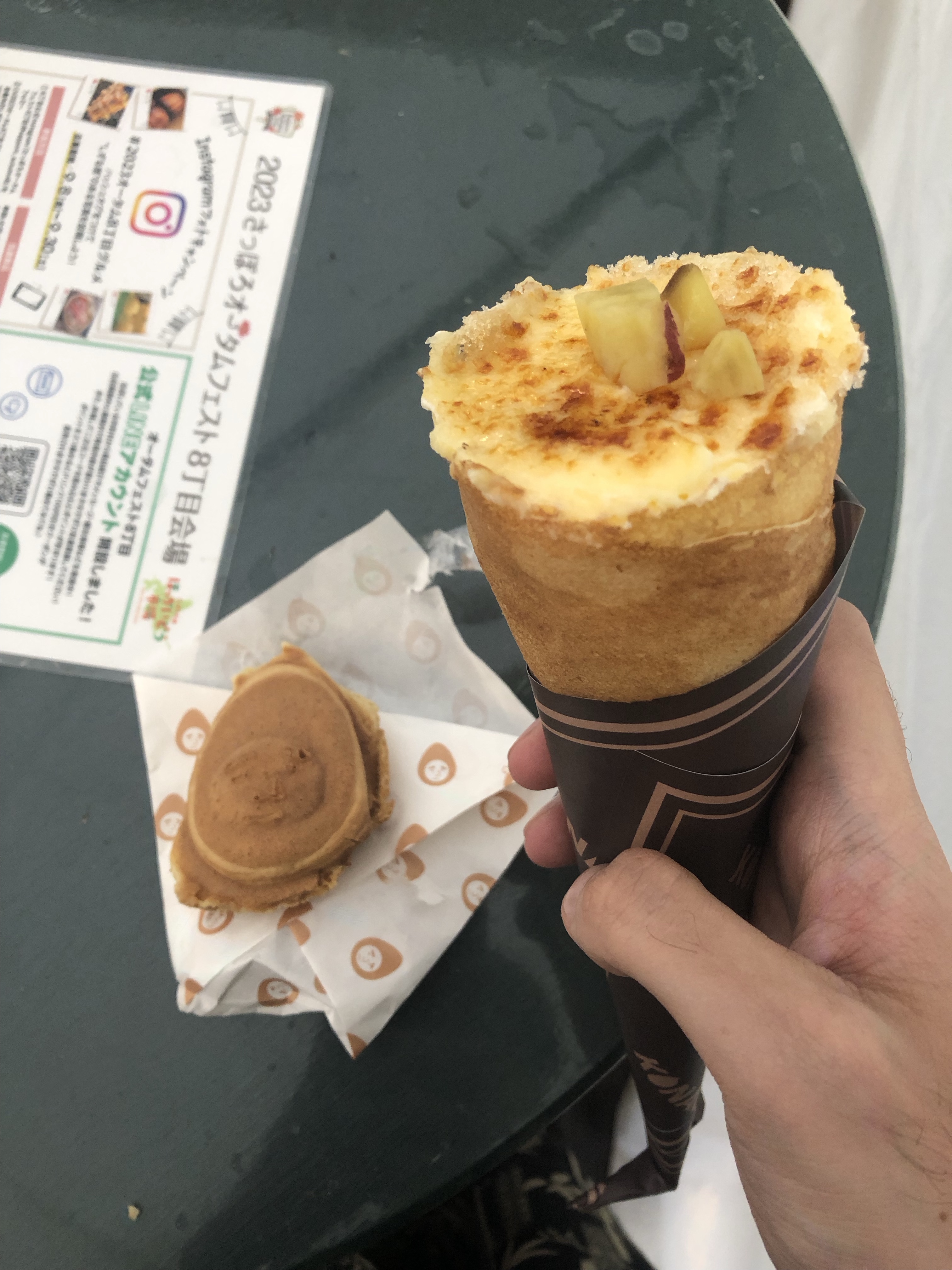 I picked towns I hadn’t heard of and wouldn’t get to visit on this trip. A giant, grilled mushroom with butter and soy sauce from Nakashibetsu; grilled scallops from Setana; “Handsome-San” (a pastry shaped like a man’s face and filled with anko) from Date; and a sweet potato crème brûlée crepe from a town whose name I’d forgotten.
