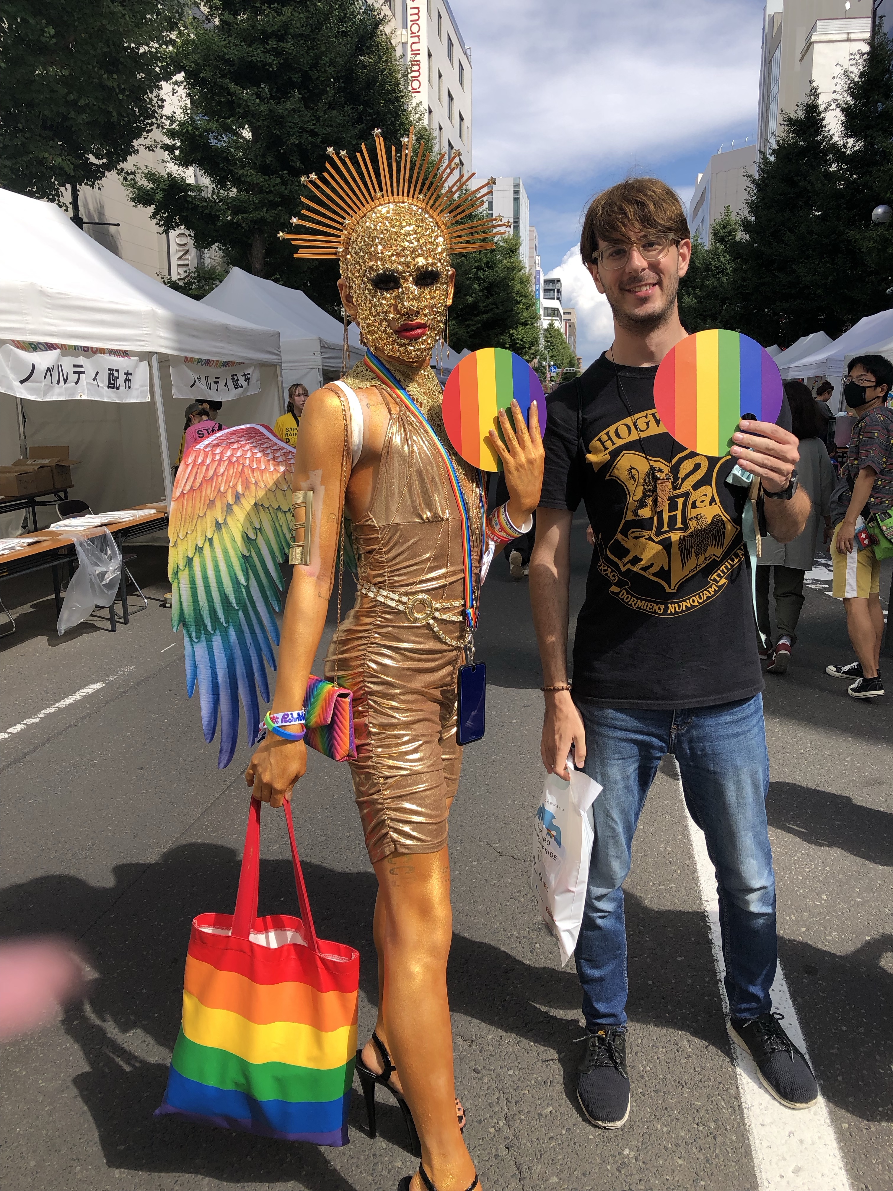 Day 1 of Sapporo Pride was just one street with booths. Expectedly smaller than pride in Tokyo (in late April) and Seoul (in early July). Just like Tokyo’s, one needed to sign for tomorrow’s parade in order to participate. I did so, and then got some free merch, such as stickers and sparkling drinks. Moreover, I recognized a Japanese drag queen I’d seen in Tokyo.