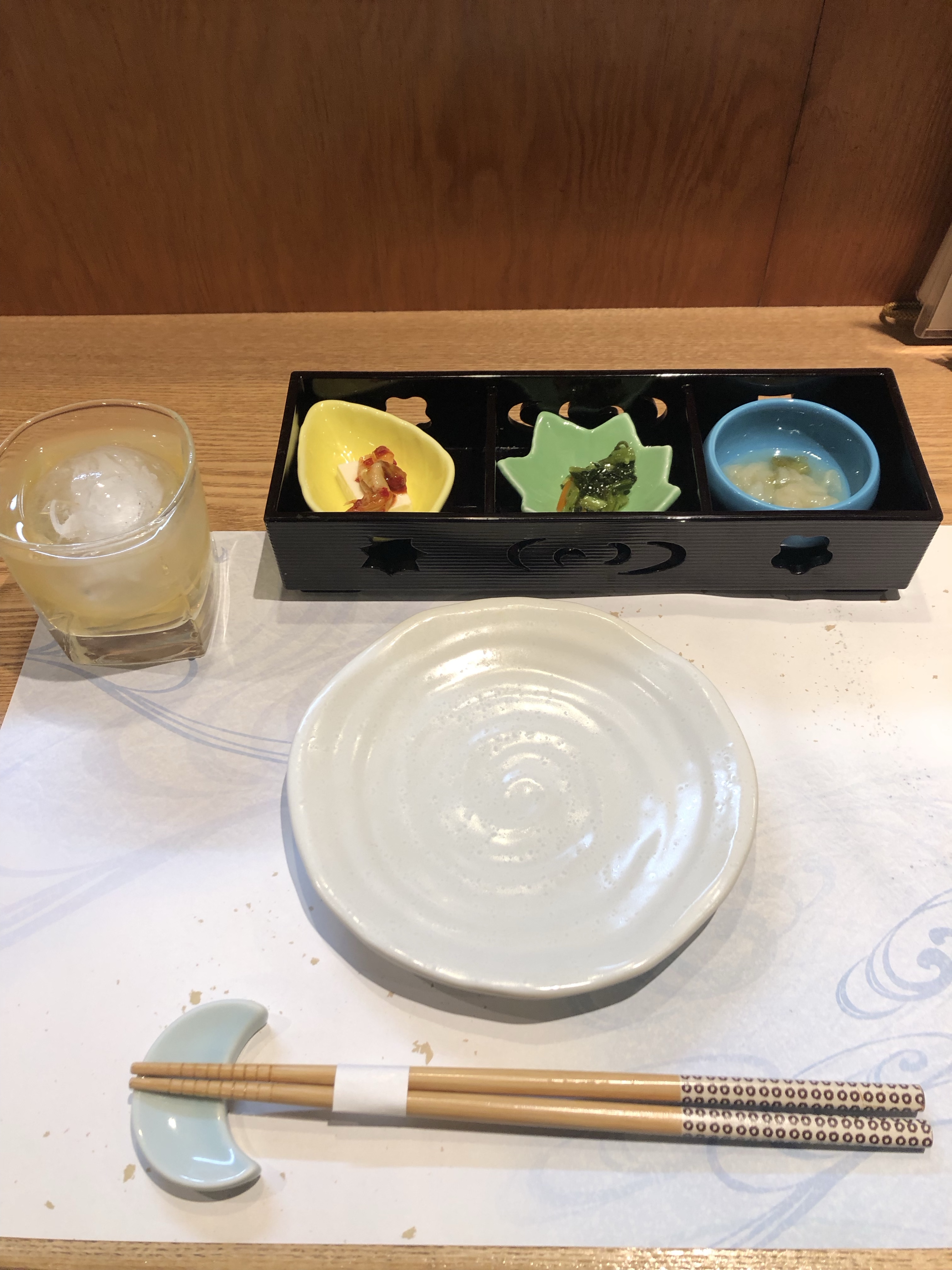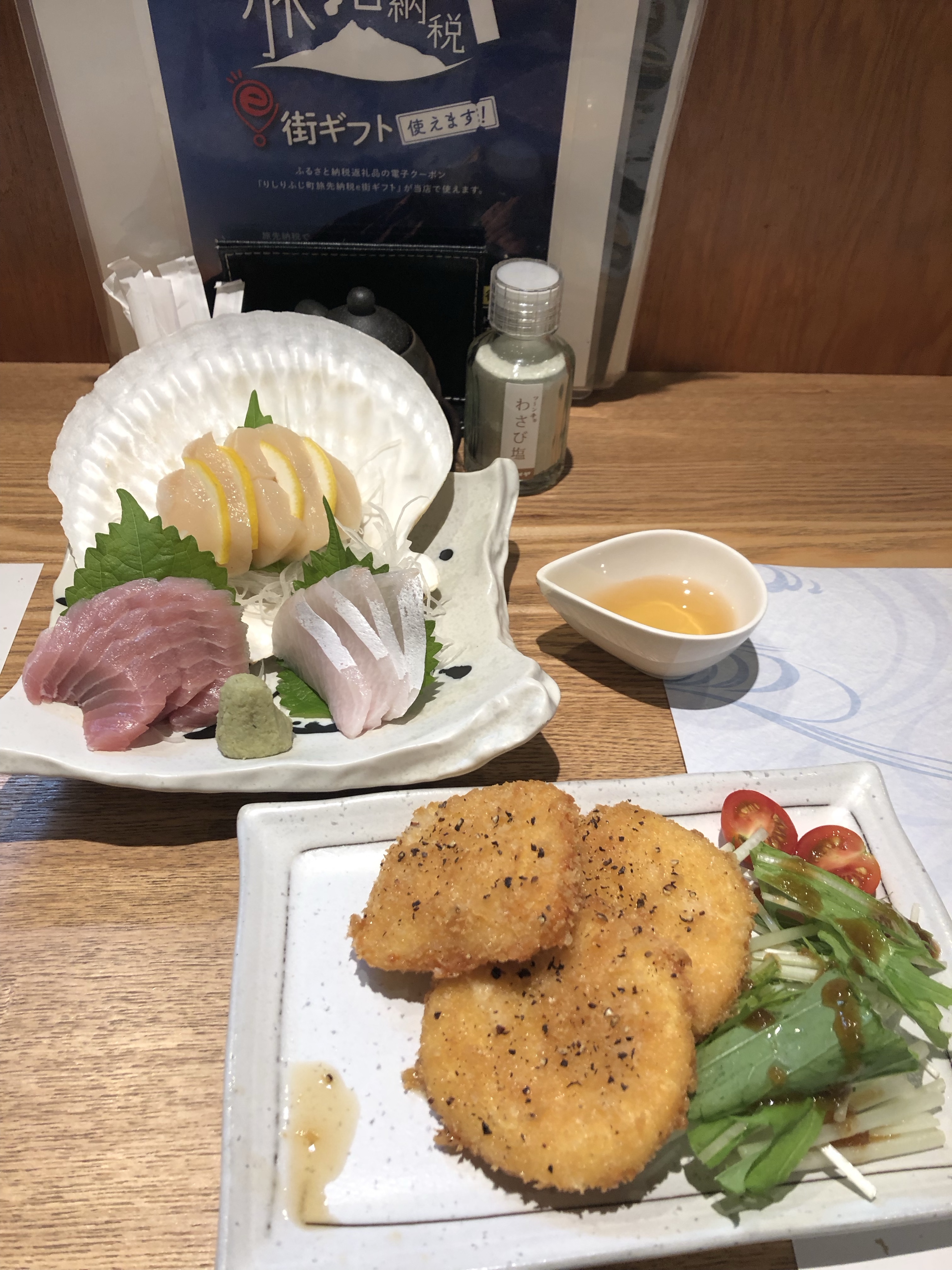 Mozzarella balls with honey (REAL mozzarella, like in Europe!); scallop sashimi with slices of lemon and sweet sauce; sashimi served on a shell with lemon slices; wasabi salt; お茶漬け, an onigiri with tea poured over it, to form a soup (I had salmon for topping, he plum); and a local plum wine, less sweet than usual, the flavour somehow stronger, with a huge ball of ice.