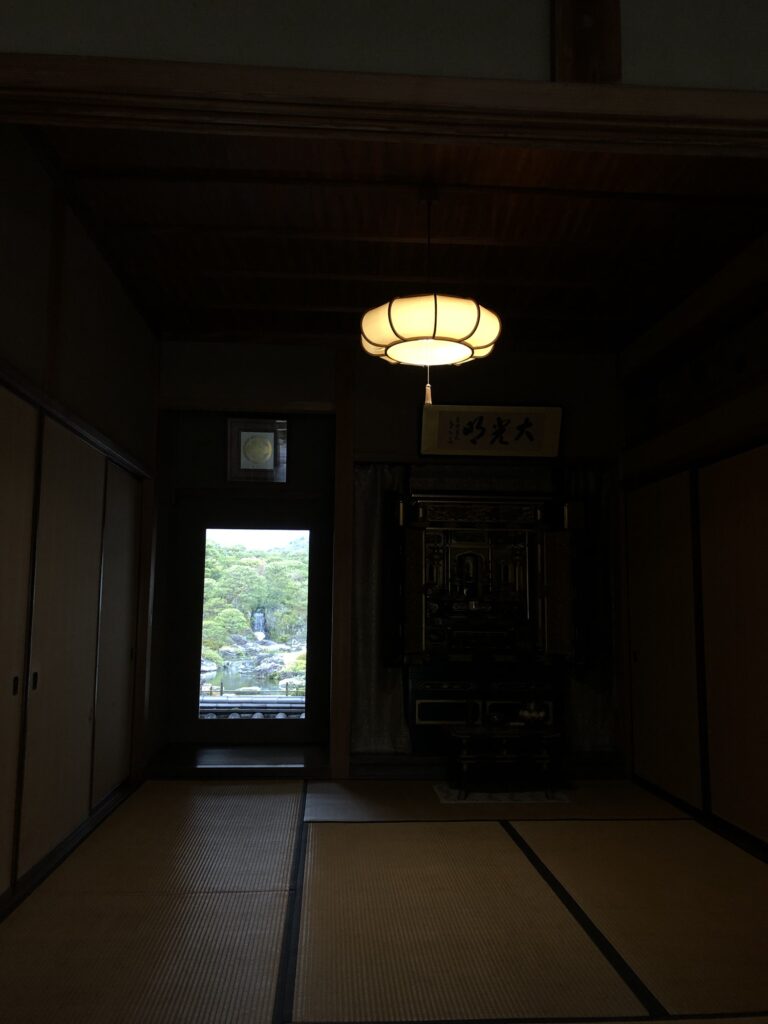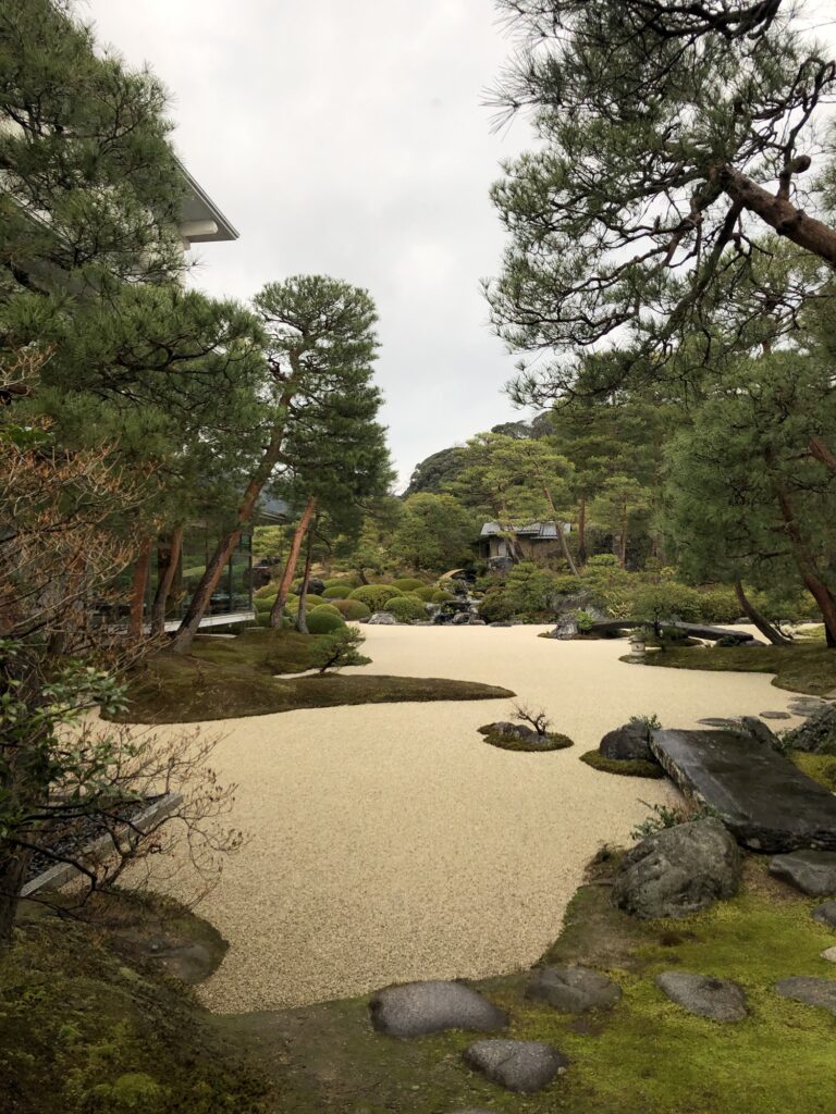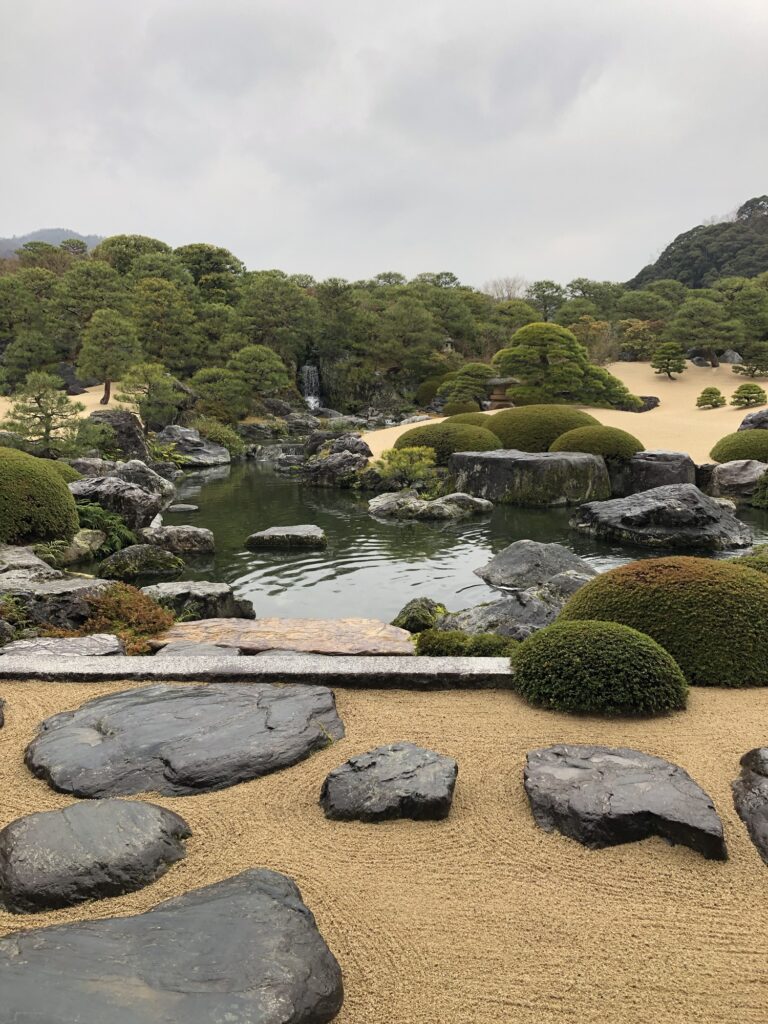 A Kyoto-style moss garden with hair cap moss, a pond garden… and the best dry landscape garden in Japan, undoubtedly the most beautiful I’d seen. Bushes were cut to perfect circles. White gravel balanced the abundance of bonsai. Rocks countered green with granite. Misty mountains loomed in the background.