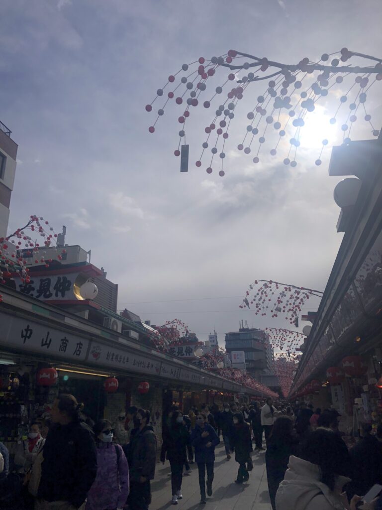 I crossed the wonderfully red and ever-busy Senso-ji temple. People in kimonos lavisher than mine. The old-school shopping avenue and Tokyo Skytree towering in the background.