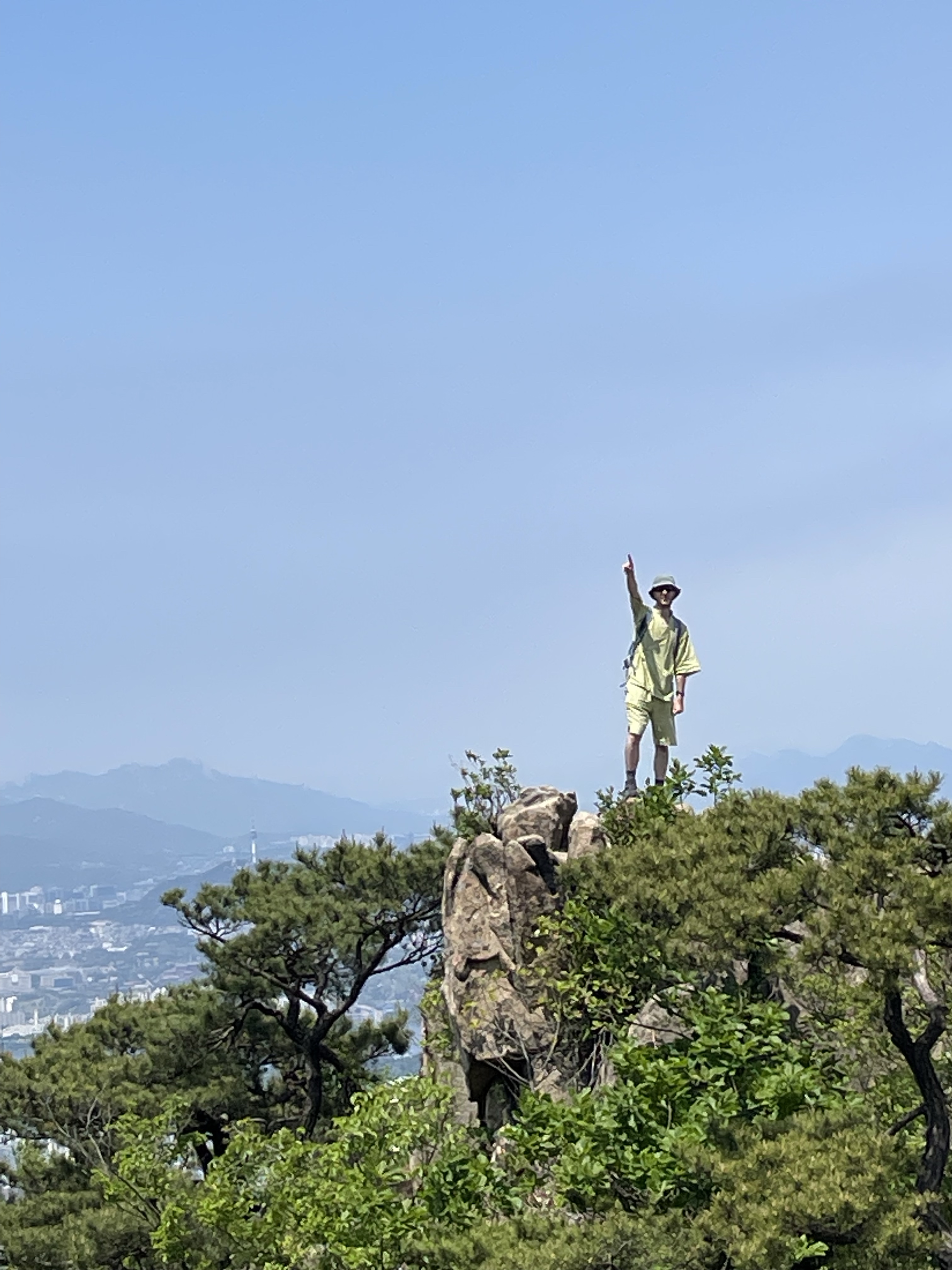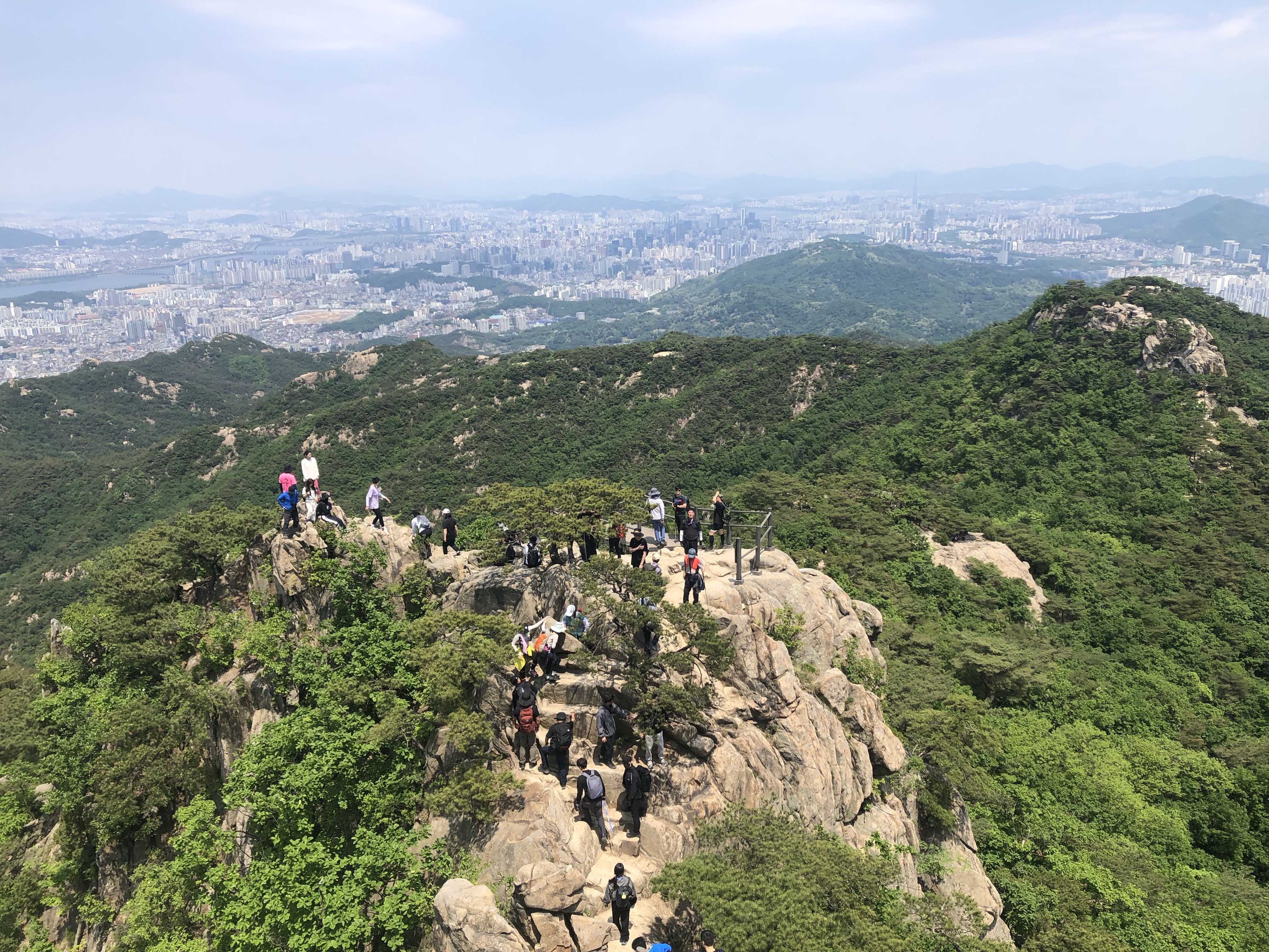 It wasn’t that long, either. All in all, one hour to Yeonjudae peak – 600 meters – including my quick break. It was extremely jagged and steep, with eccentric rock formations, and a 360-degree view of the city. One half of my view was pure green; the other, pure gray.