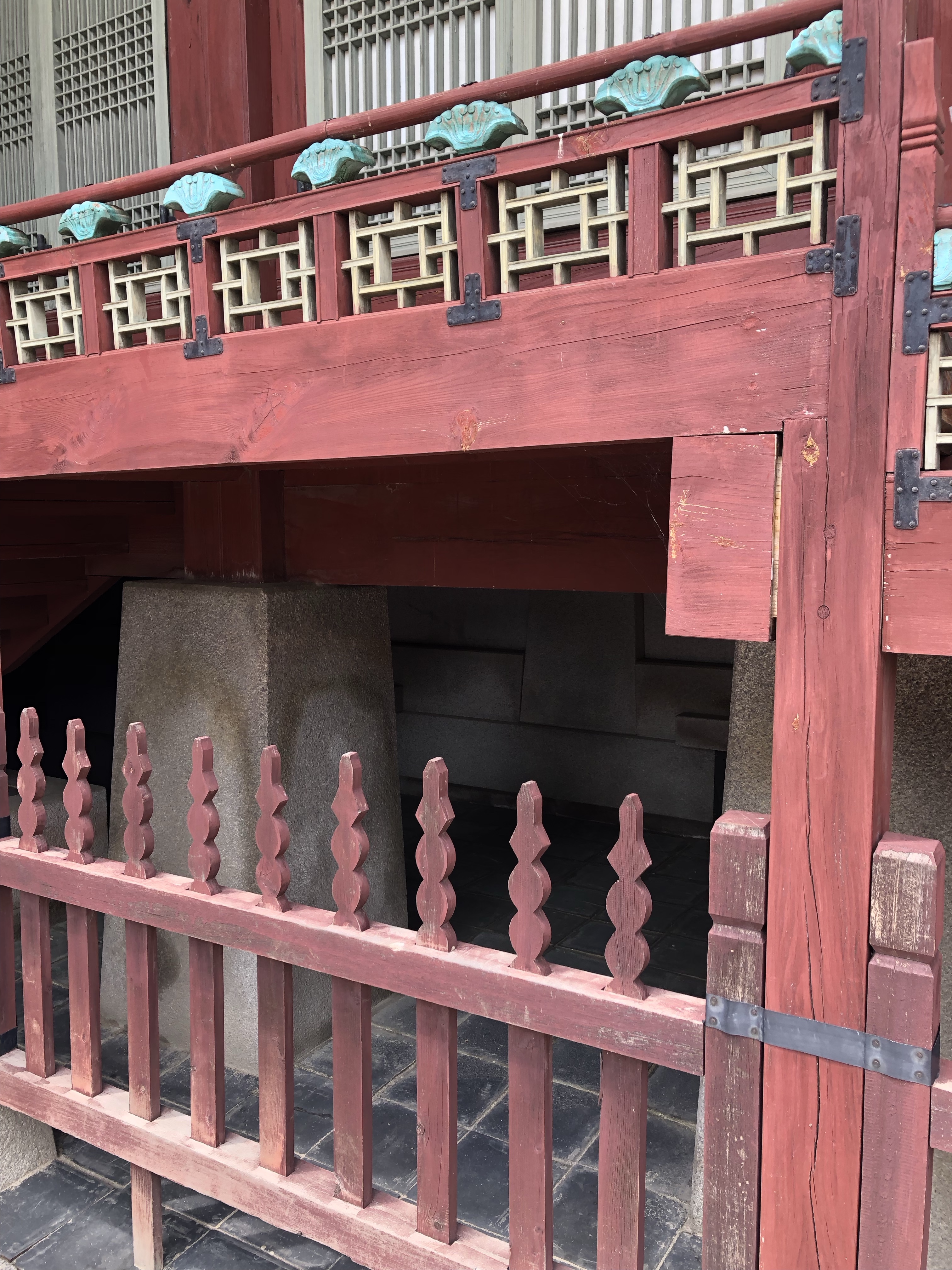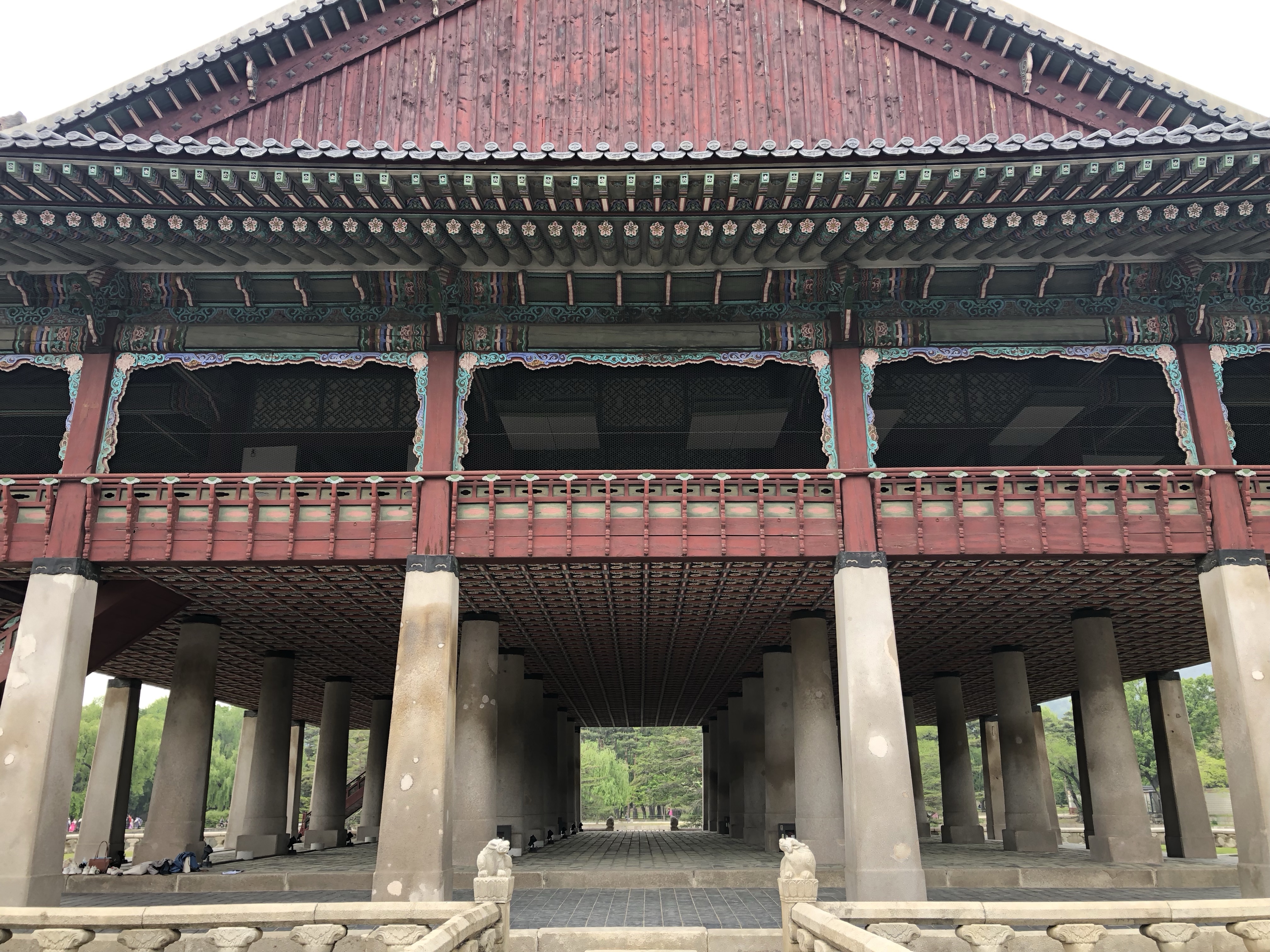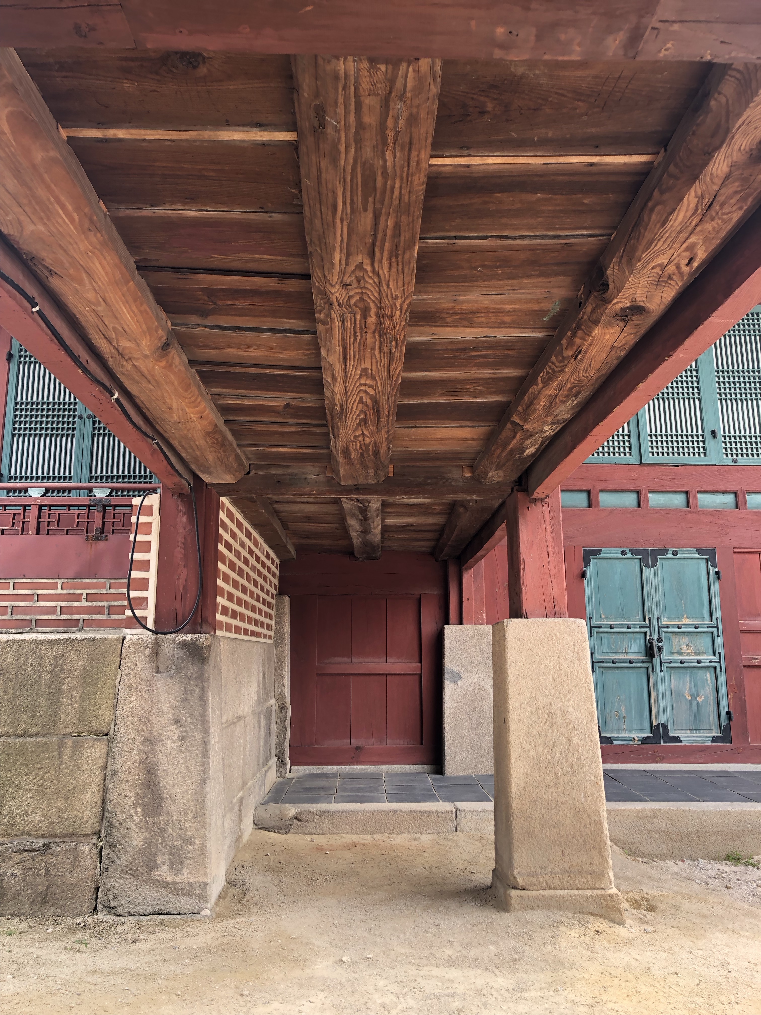 Every structure being raised on stone pillars created a multitude of liminal spaces: tiny, dark, cool openings underneath colorful halls and painted wood. I peeked in and crouched through some of them. They offered solace from the sea of hanboks, silence from the cacophonic tourists. It was an unexpected charm of the palace.