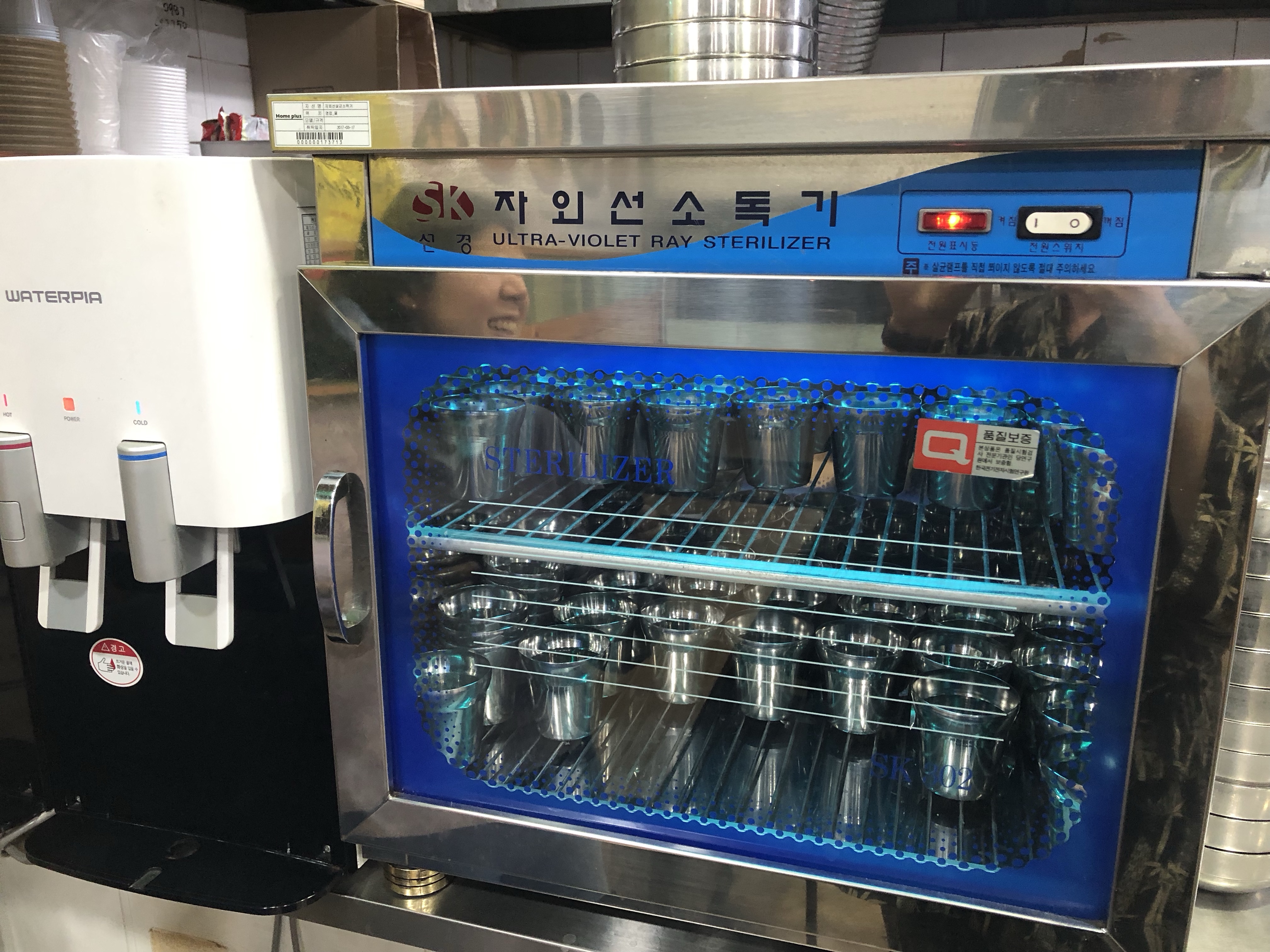 Metal cups in restaurants are stored inside UV ray sterilizer.