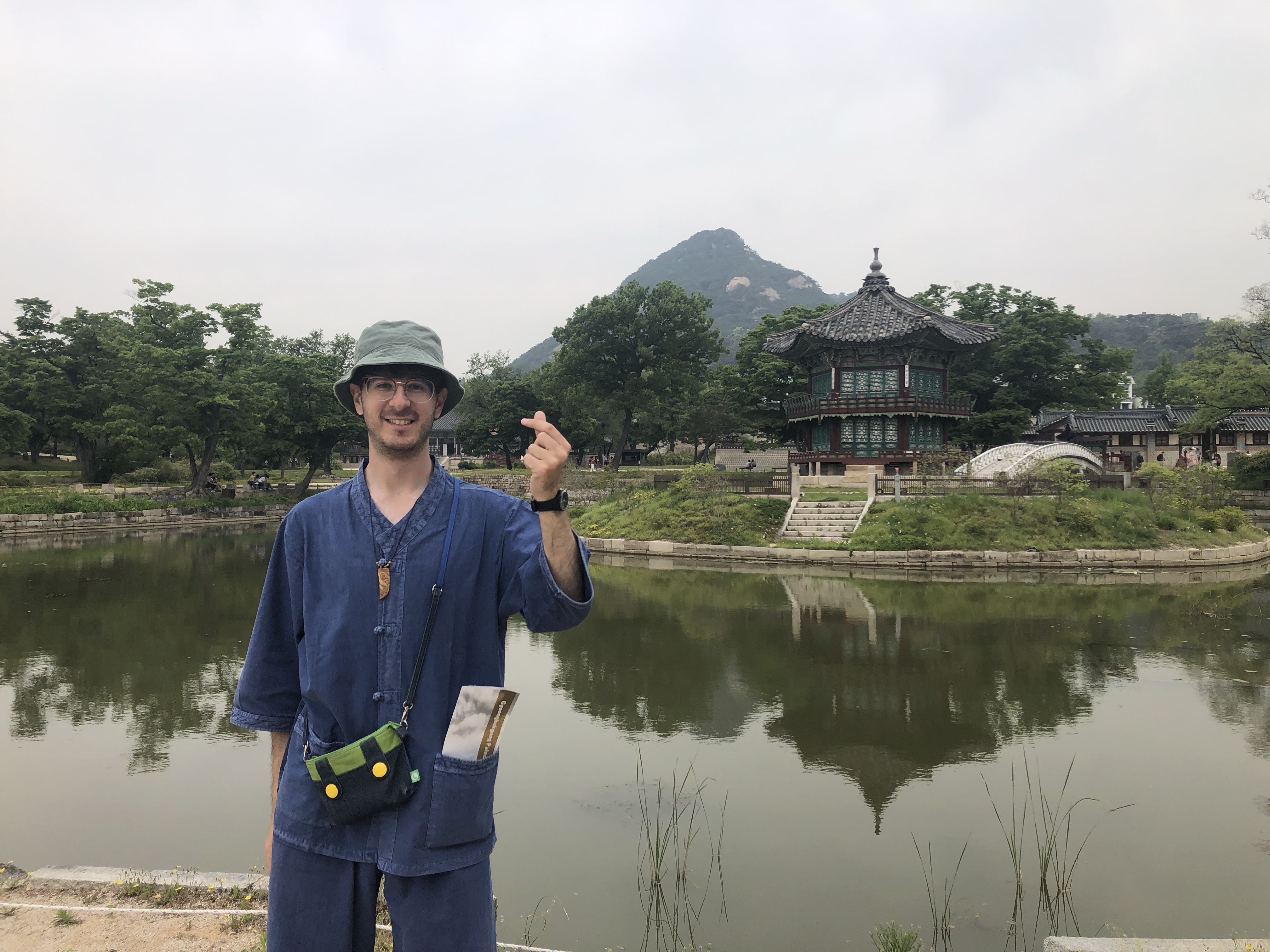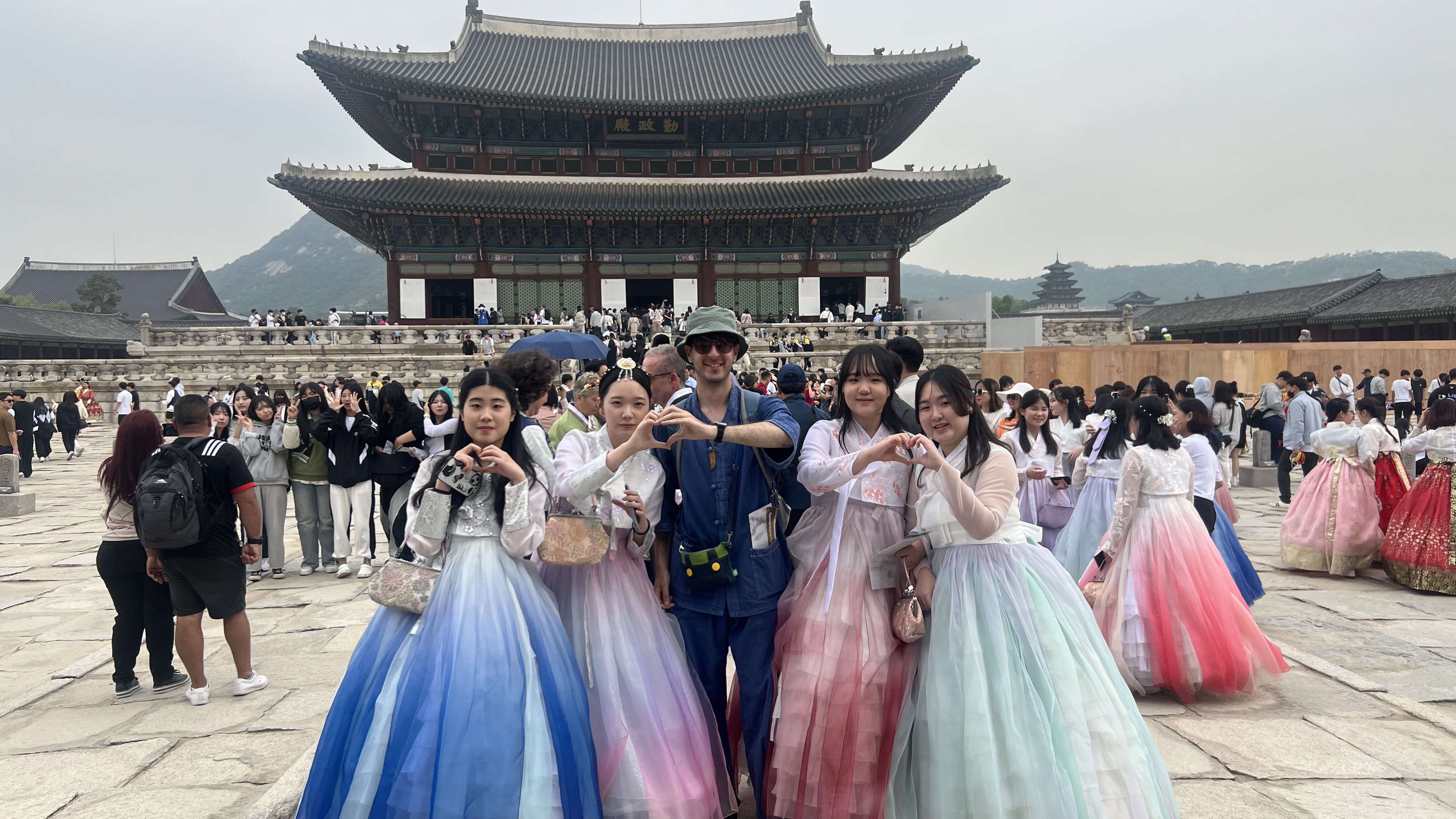 A bunch of Korean girls in hanbok saw my hanbok and asked for a photo. We posed together, making heart shapes. That cheered me up.