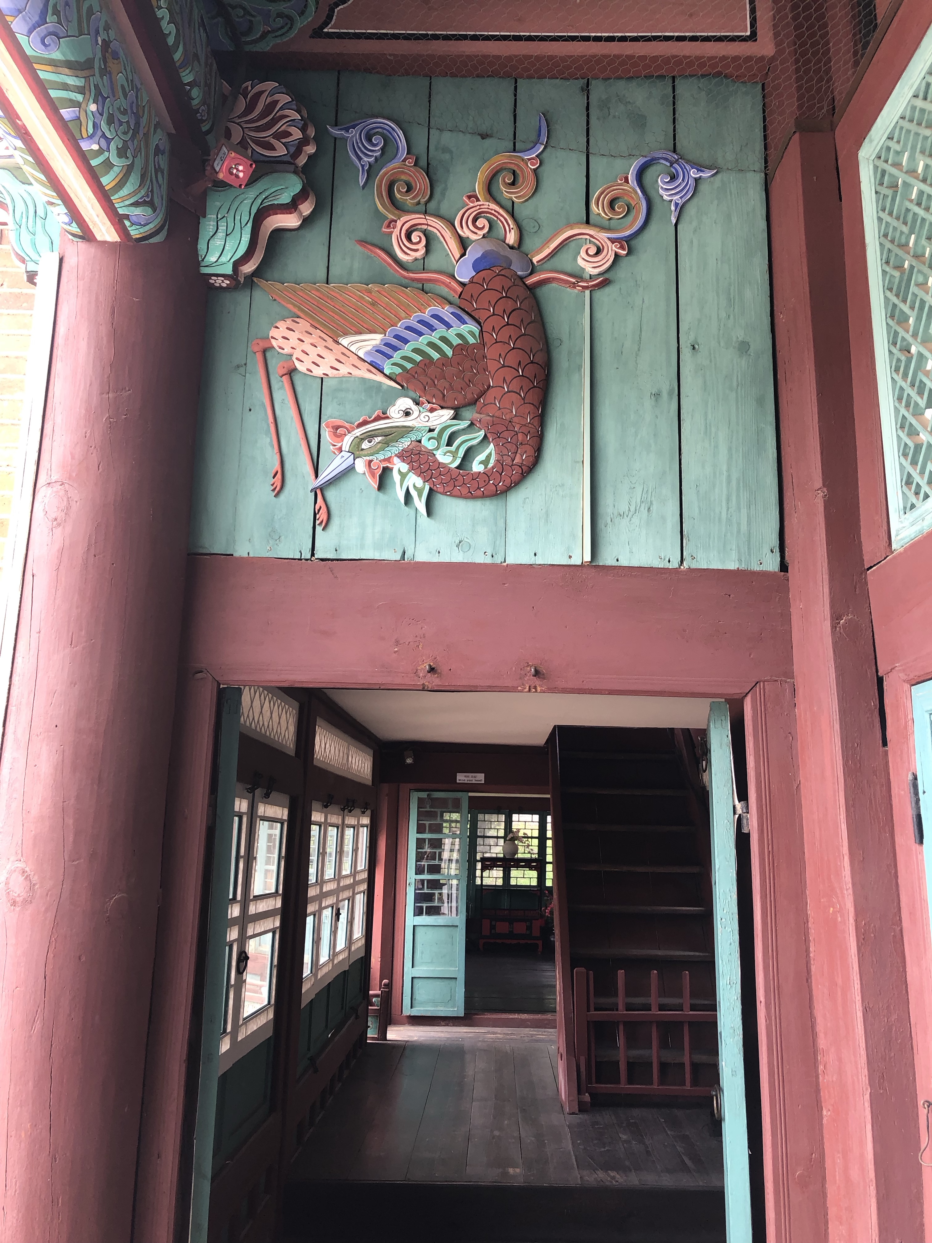 The northernmost halls were considered “exotic” due to their Chinese characteristics. I took off shoes and put on slippers at the entrance to the library. History books about Korea and the rest of the world. Gorgeous paintings on the doors, walls, and ceiling, especially of dragons and peacocks. I adored the color combination of redwood, aquamarine, hardwood, and white. Pops of orange and sea blue. Breathtaking.