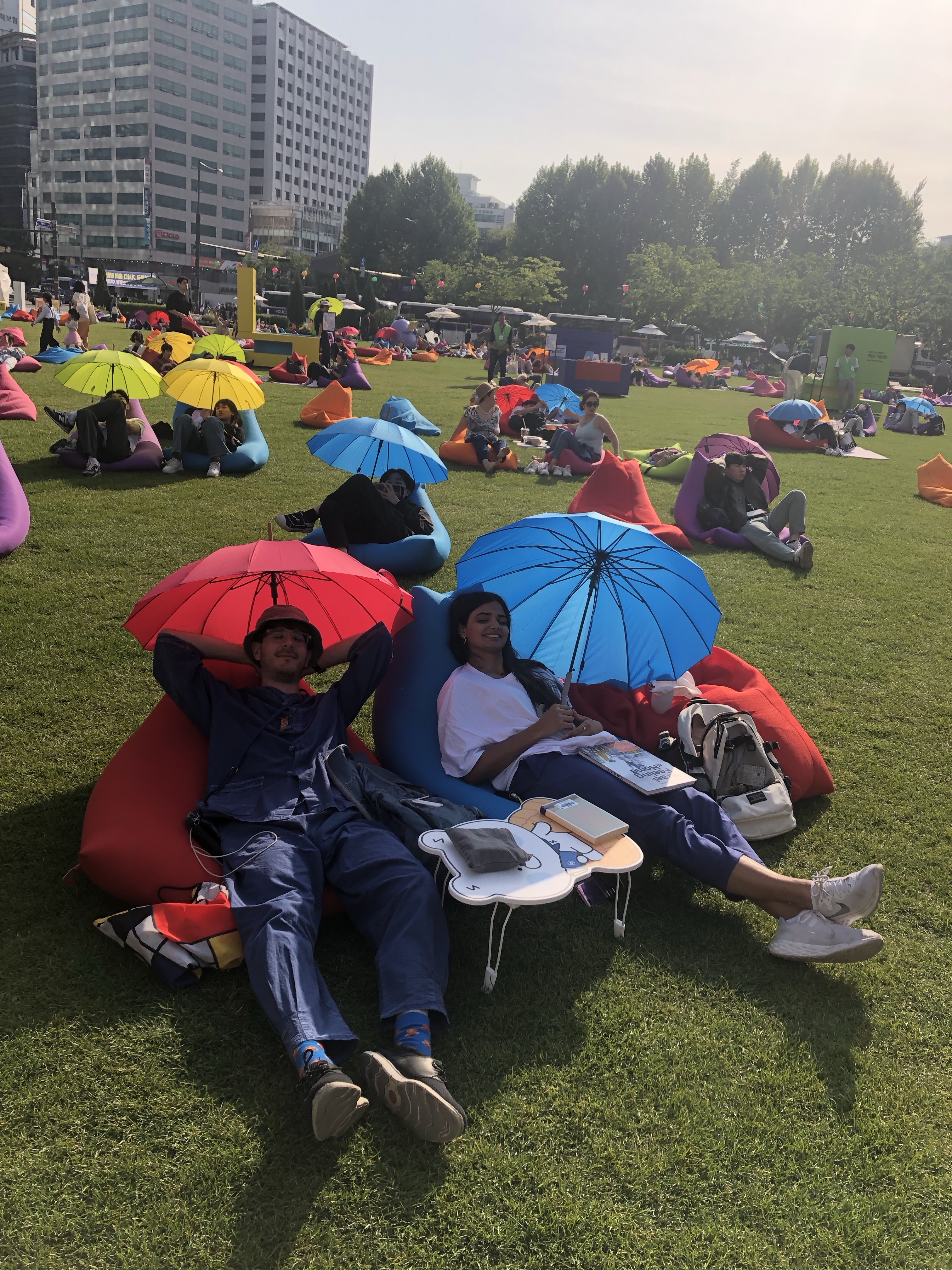 At Seoul Plaza, the Seoul Outdoor Library was in full force. Performances every weekend during summer, with colorful bean bags for everyone to lounge on. I collapsed on one in front of a concert and had my first bite of the day at 15:20.