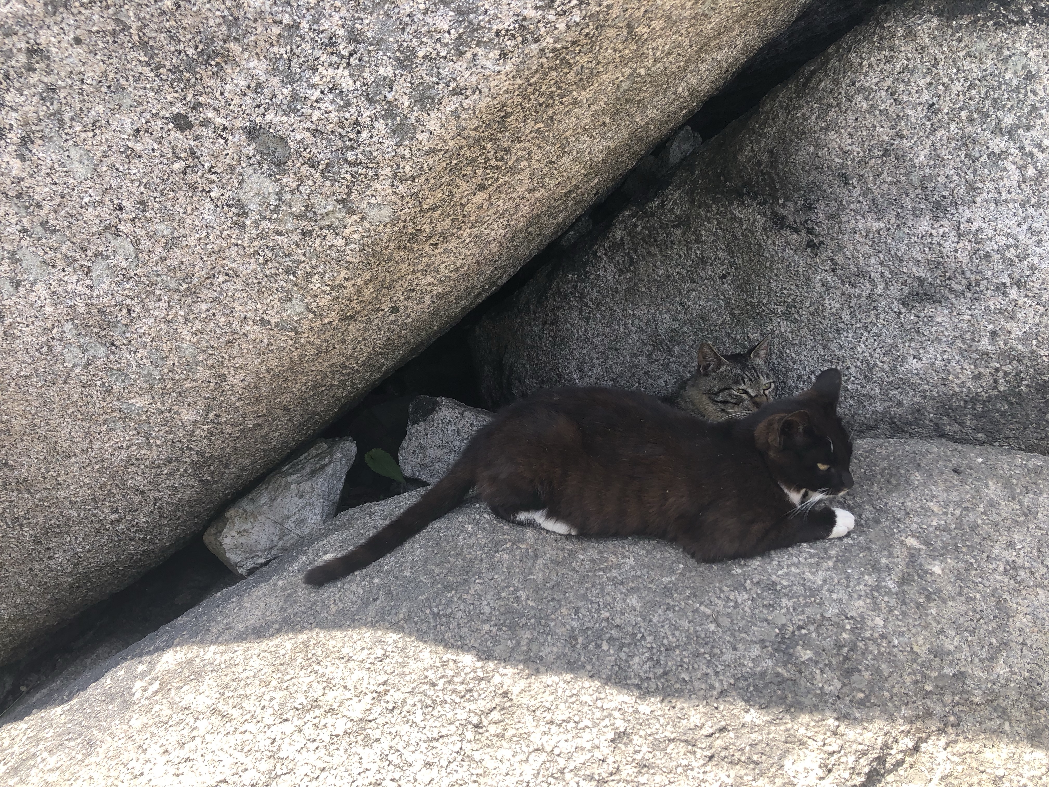 Wild cats arrived at some point. All in different colors, with green eyes. A pack of five or so lived under the boulders on the peak.