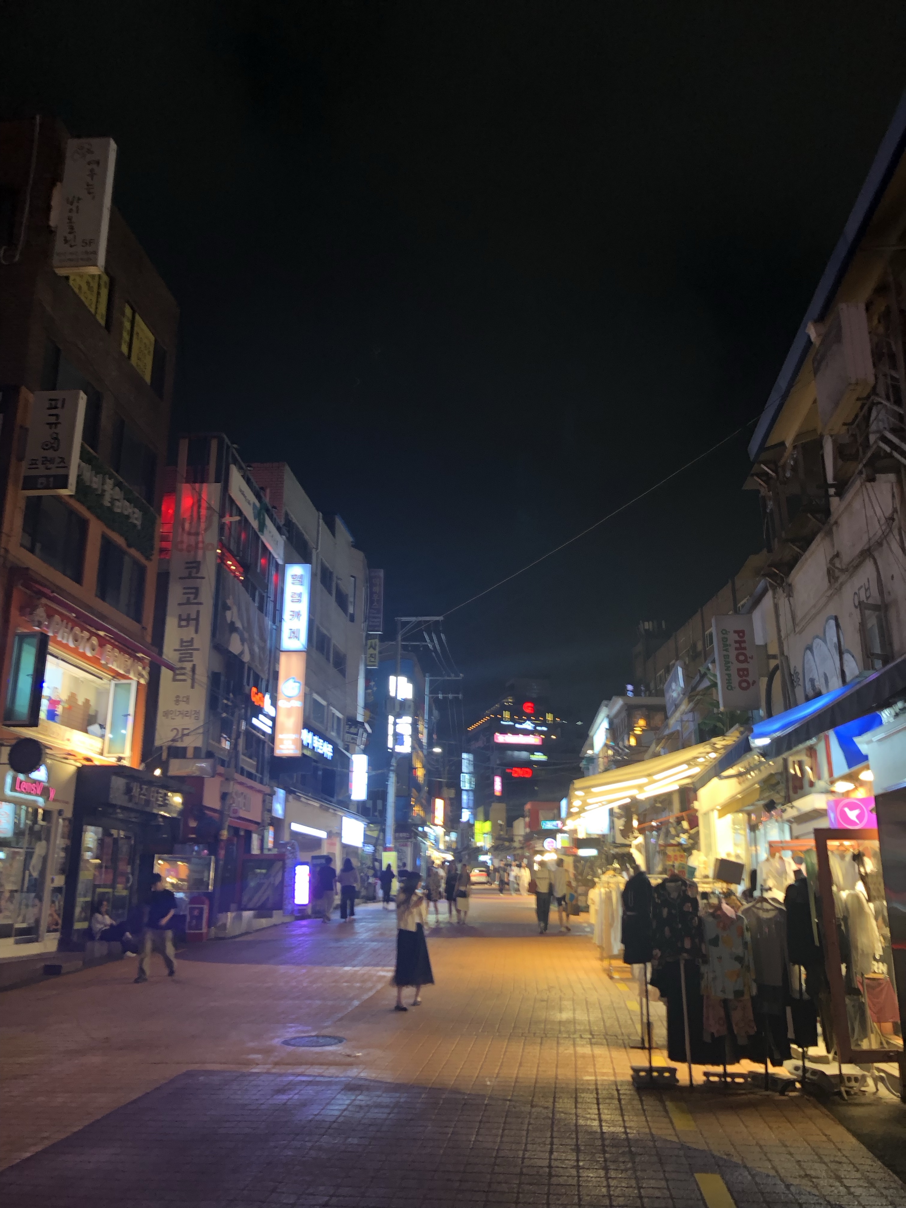 It was the hip student nightlife neighborhood in Seoul. The trendiest place to party. Relatively lively, despite it being a Wednesday night. Mostly foreigners though.