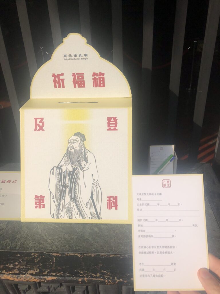 Fit for a temple, the prayer hall was golden all right. Inside, however, was no image of Confucius. Instead, his tablets. On the middle, black one, president Chiang Kai-shek had written in gold: “Education for All”. There were also sheets of paper with a prayer form to be filled and inserted into a box.