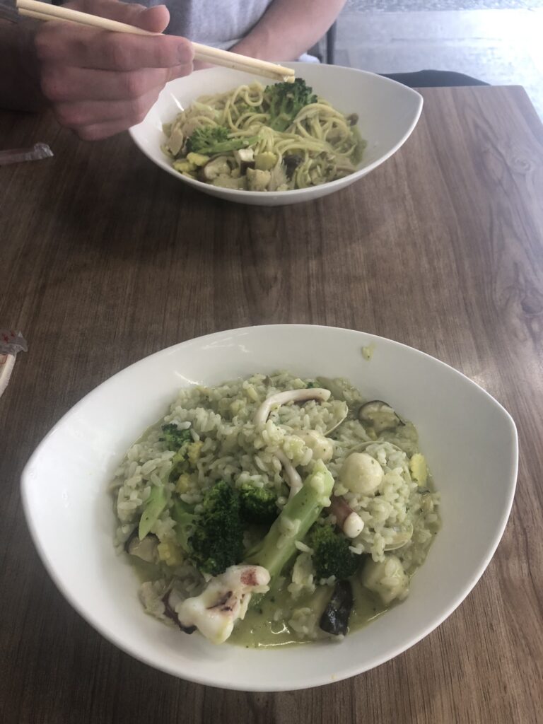 After a refreshingly short shift, I had lunch with Bob at one of the eateries on the corner of the hostel, behind the Red House. I got a pesto seafood risotto. How I’d missed pesto.