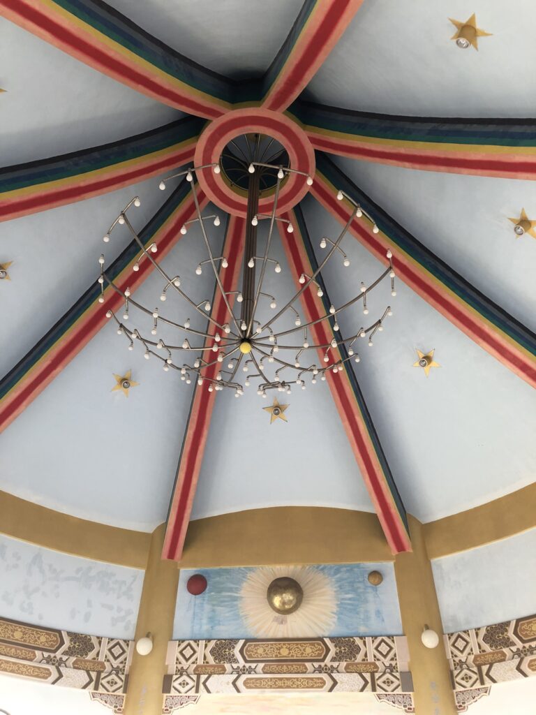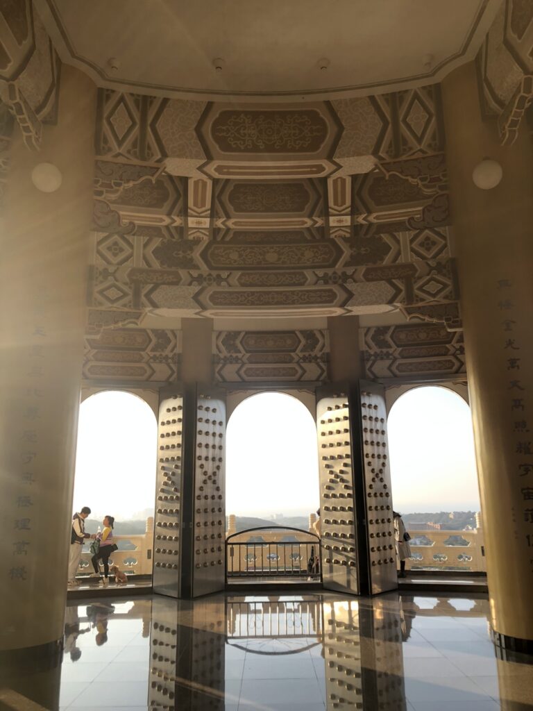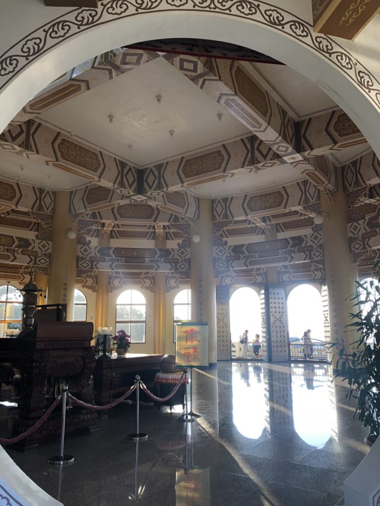 In the absence of explanations and a reliable Taoist friend, I focused instead on the impressive architecture with its many shapes and patterns: columns, circles, a light color palette. The exterior featured dancheong-like beams under each tier. The top floor boasted a lavish chandelier hanging from a rainbow ceiling. Several people were meditating on mats, eyes shut and legs crossed, seemingly forever.