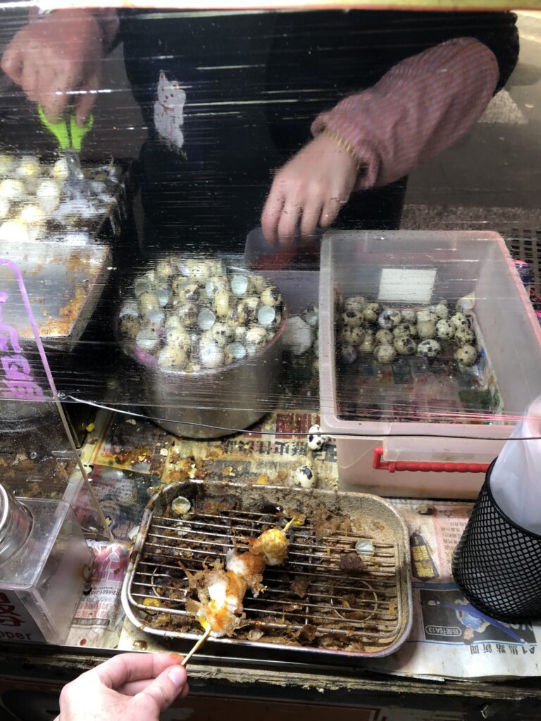 At 23:00, Bob and I scoured Ximen for some street food. I found an omelet radish cake so tender, that I wolfed it down while still hot. Then I stumbled across a stand selling fried quail eggs on a skewer. Just as decadent. The onion dumplings I finished with were okay.