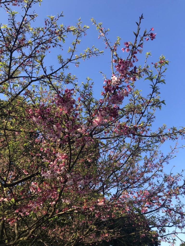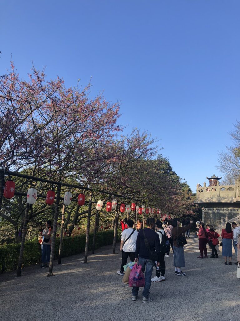 It was past the peak. The lower branches were already naked. Tiny pink and white petals embellished treetops, yet the quantity, vividness, and size of these could not hold a candle to Japan. One row of half a dozen trees. Today was the height of the temple’s cherry blossom festival.