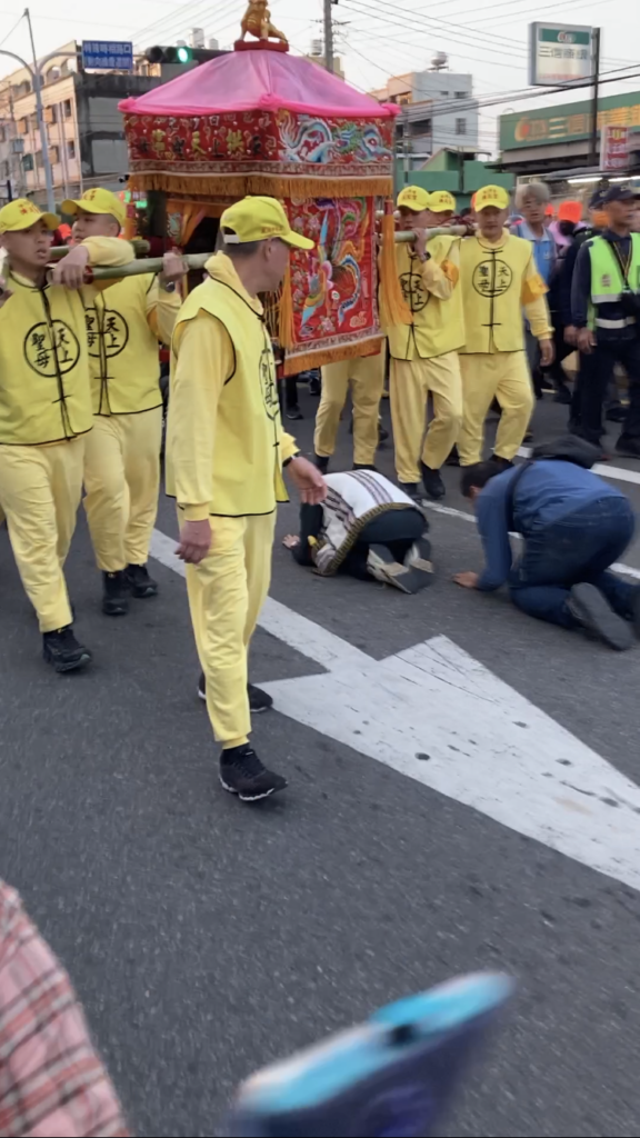 Then the palanquin arrived. So tiny and modest, that I wouldn’t have guessed it. I prostrated on the road and let the carriers pass the palanquin above me, to receive Mazu’s blessing.