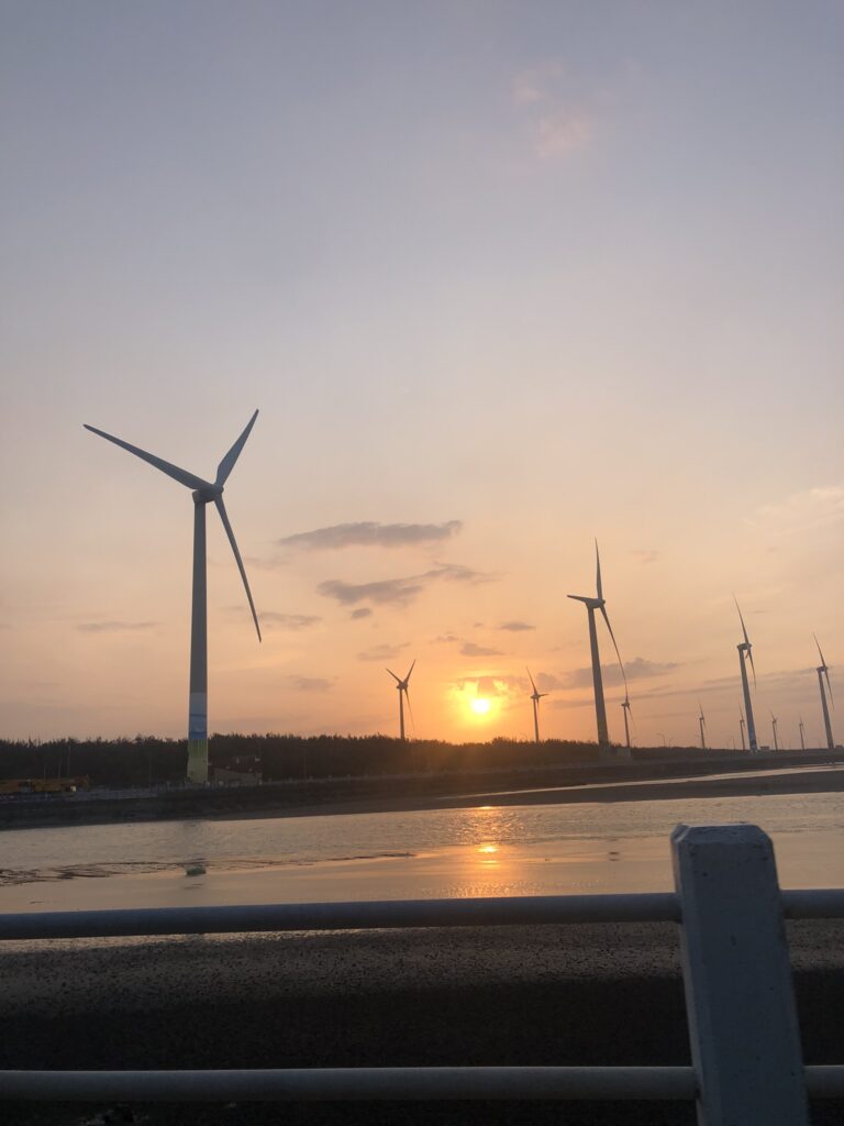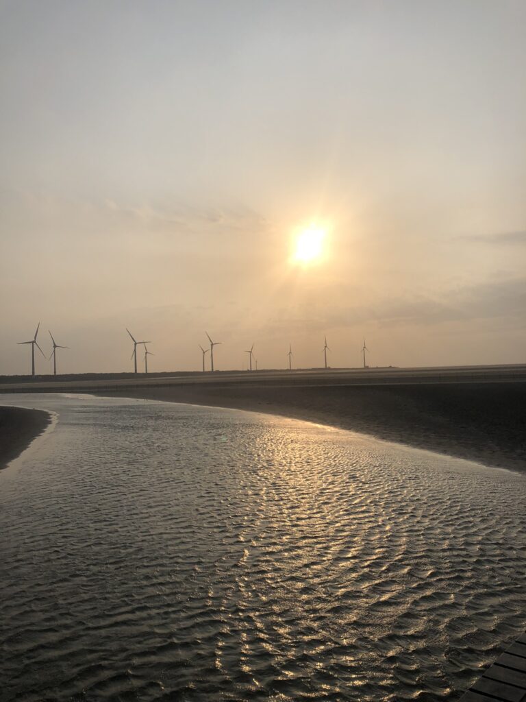 In the afternoon, her parents returned home, while we drove to Gaomei wetlands, known for its picturesque mud, wind turbines, stream, and soil.