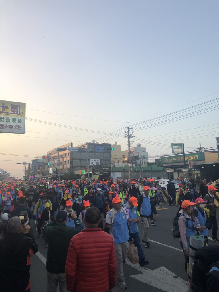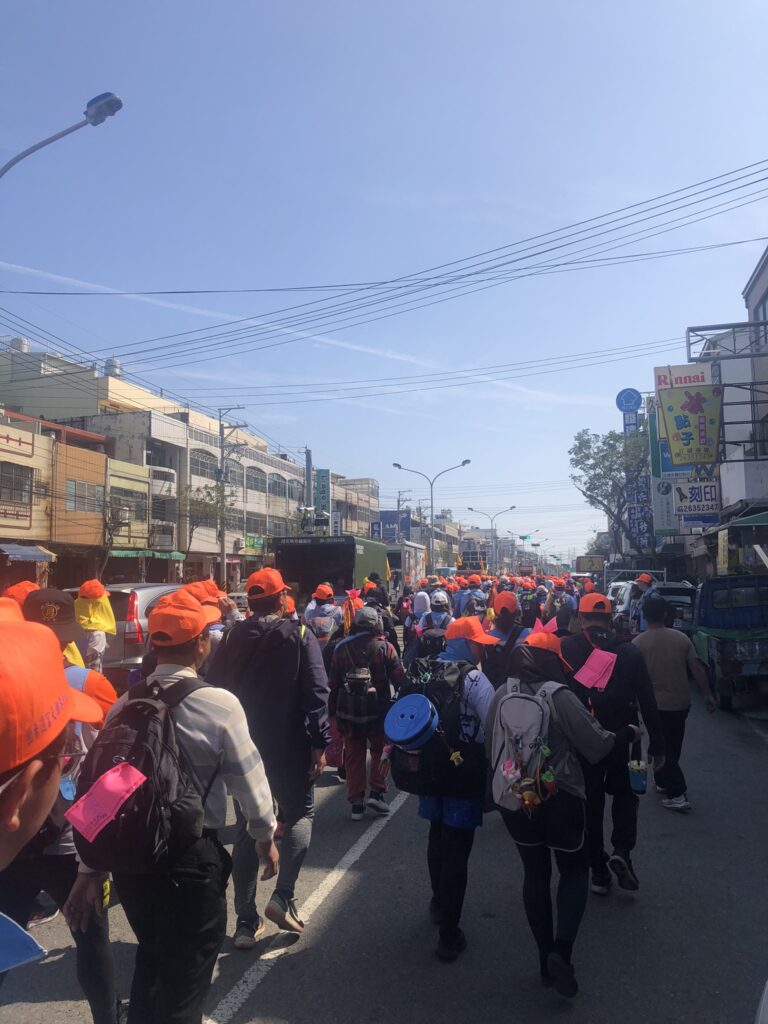 With more free time in Taichung than expected and the discovery of a famous pilgrimage crossing the city today, I rushed to the train soon after waking, without charging my phone or eating. At Shalu station, a western district by the coast, hundreds of people wearing neon orange caps were walking south. I’d come to the right place.