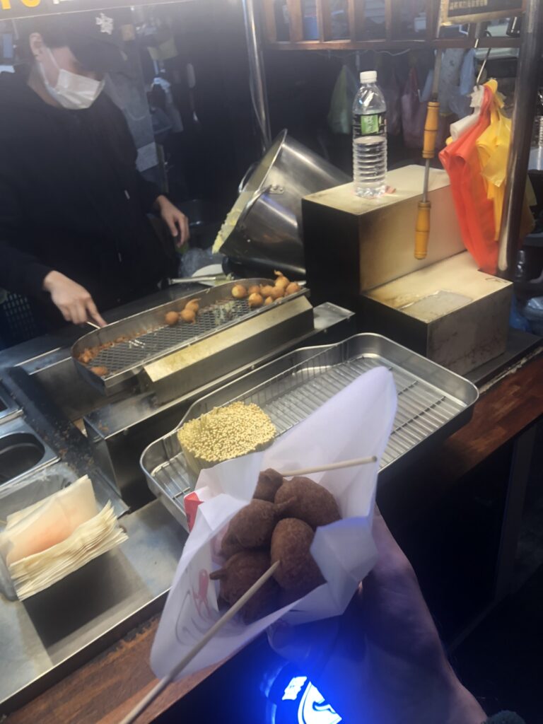 We grabbed a rice sausage and escaped in her car. Near her house, we dined at her local night market.