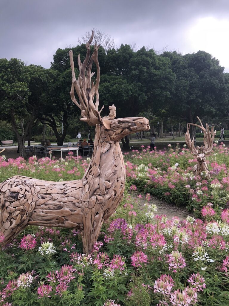 Da’an was the biggest park in Taipei. Pleasant, if fairly ordinary. There were a seasonal azaleas festival with white butterflies fluttering about; picnickers; elders resting or working out; an amphitheater; a nice pond; and rest pavilions. A year ago in Japan, I’d visited one of the biggest azalea festivals in the world.